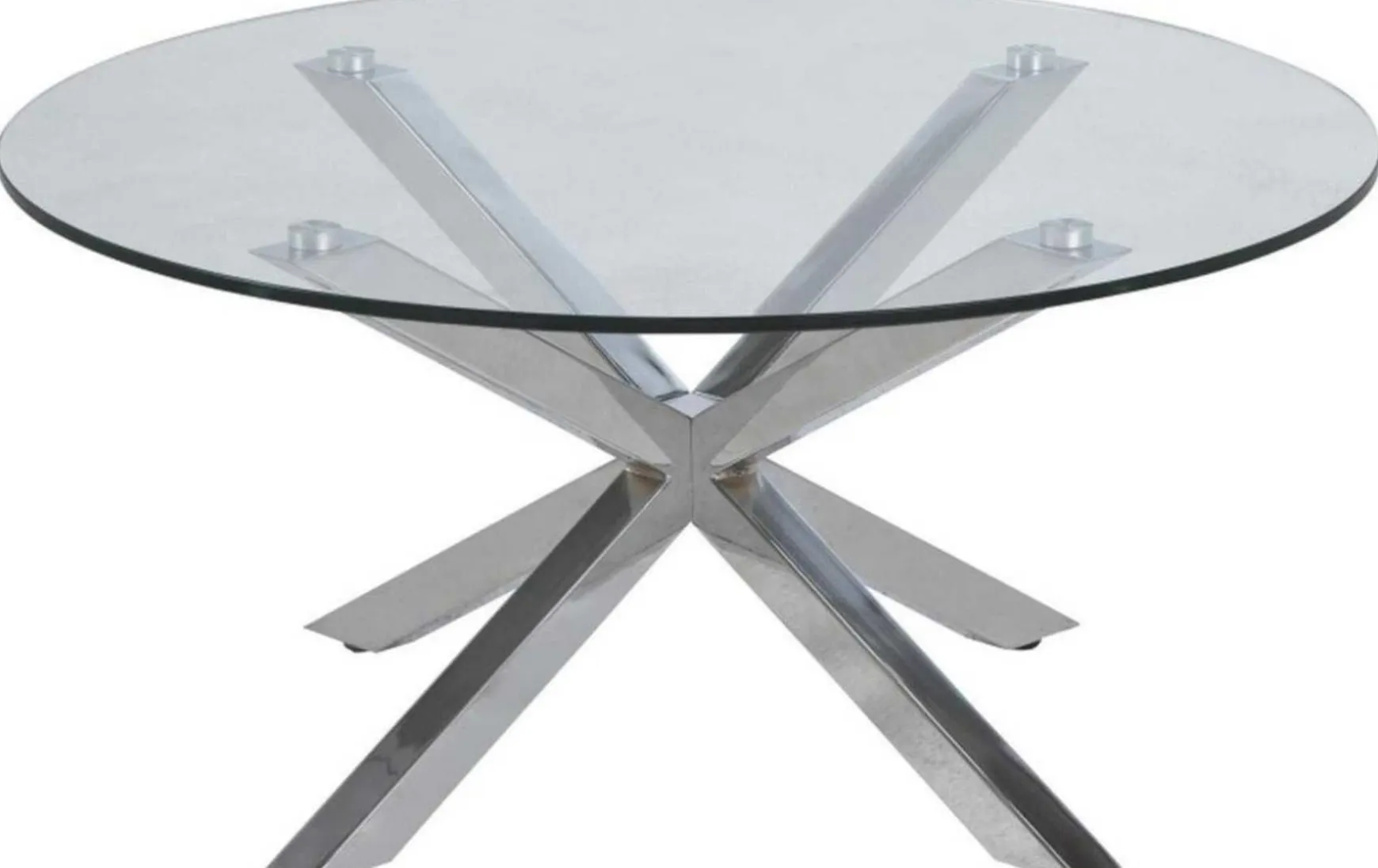 Dieser moderne Couchtisch setzt mit seiner runden Glasplatte und dem sternförmigen Chromgestell stilvolle Akzente im Wohnbereich. Die klare Glasoberfläche verleiht dem Tisch eine leichte, elegante Optik, während das glänzende Chromgestell für Stabilität und einen zeitgemäßen Look sorgt. Ideal als zentraler Blickfang im Wohnzimmer