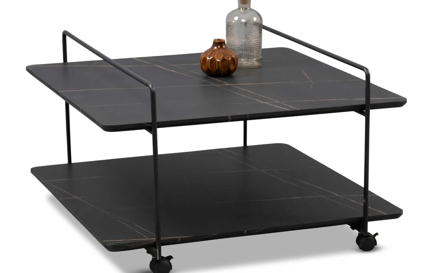 Dieser moderne Couchtisch überzeugt durch sein elegantes Design in edler Marmoroptik und praktische Funktionalität. Die Kombination aus schwarzer MDF-Deckplatte, Sicherheitsglas-Ablage und einem stabilen Metallgestell verleiht dem Tisch eine hochwertige Ausstrahlung. Dank der integrierten Rollen lässt sich der Couchtisch flexibel bewegen und passt sich mühelos Ihrem Wohnraum an.