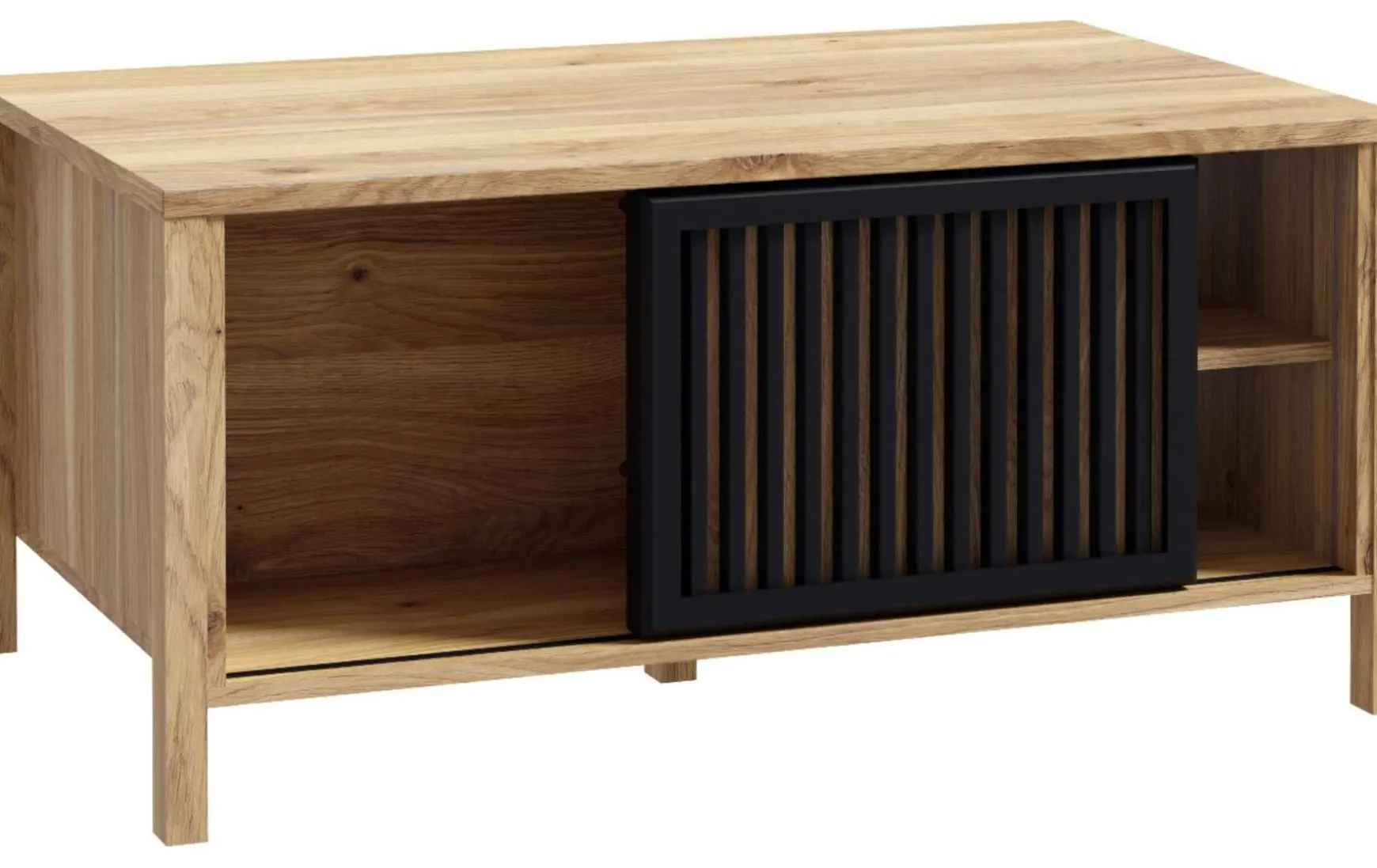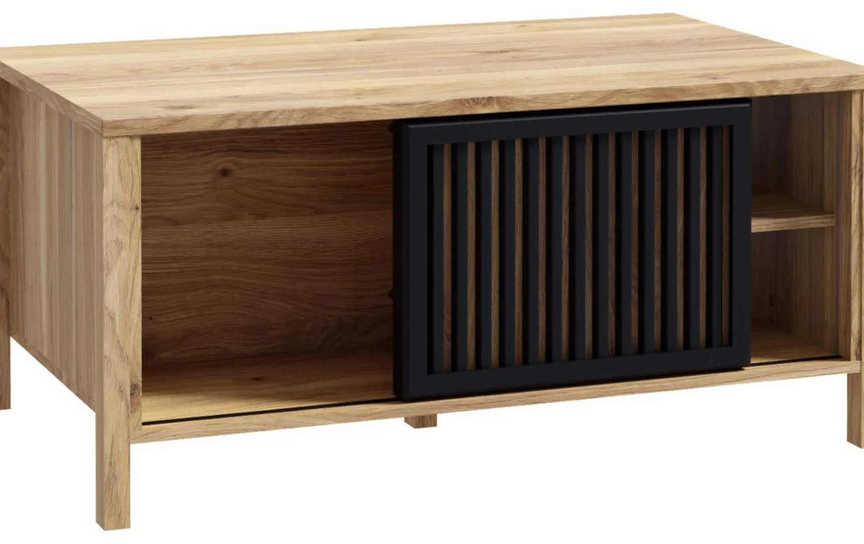 Dieser Couchtisch mit Lamellen ist eine perfekte Ergänzung für ein Wohnzimmer im modernen oder industriellen Stil. Die praktische Arbeitsplatte bietet viel Platz für Heißgetränke, Kuchen, salzige Snacks und Dekorationen. Unter der Arbeitsplatte finden Sie zwei offene Nischen, in denen Sie ein Buch, Zeitschriften, eine TV-Fernbedienung, Servietten oder Tischsets ablegen können. Hinter den stilvollen, schwarzen Lamellen-Schiebetüren verbirgt sich zusätzlicher Stauraum für Dinge, die Sie beim Entspannen griffbereit haben möchten. Dekorieren Sie das Wohnzimmer Ihrer Träume, indem Sie einen Sessel oder ein Sofa und einen Couchtisch zusammen mit anderen Möbeln aus der Kollektion in dessen Herzstück stellen.