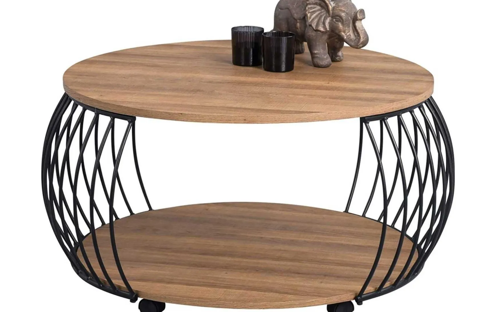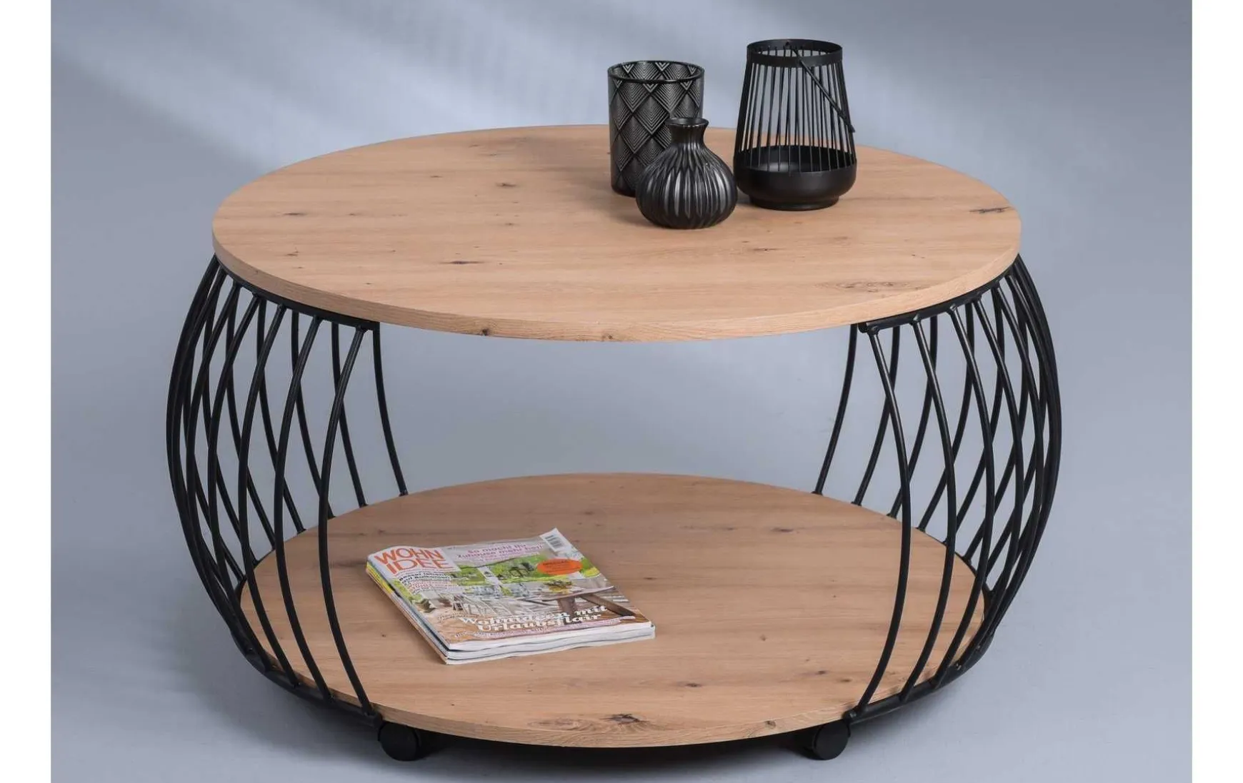 Die bauchige transparente Form in Kombination von schwarzem Metall und Artisaneiche-Dekor machen diesen durch Rollen mobilen Tisch zum gern gesehenen Element.