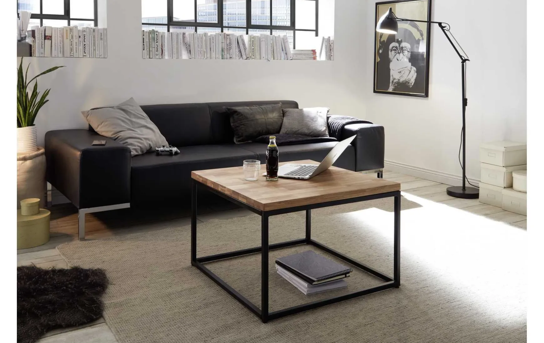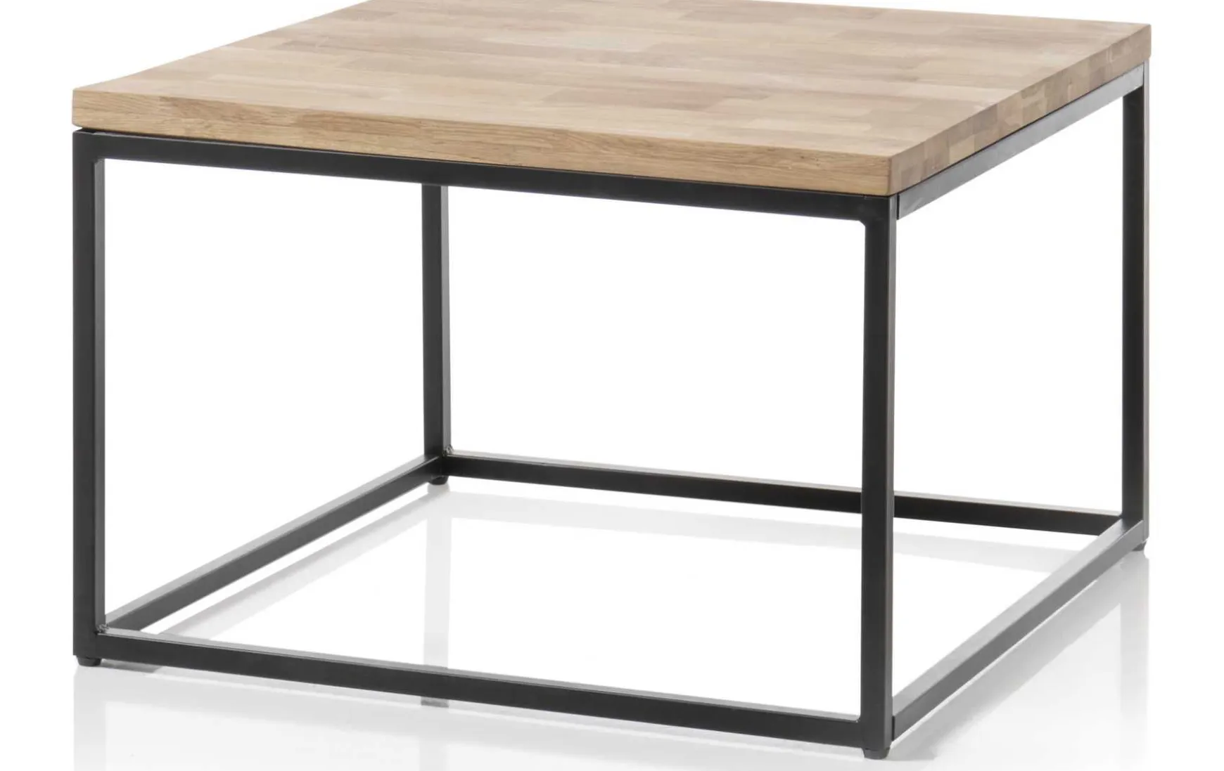 Asteiche massiv, geölt, dadurch unempfindlich gegen Flecken und Feuchtigkeit. Mit gerader Kante an der Längsseite. Extra stabiler Couchtisch mit stabilem Metallgestell.