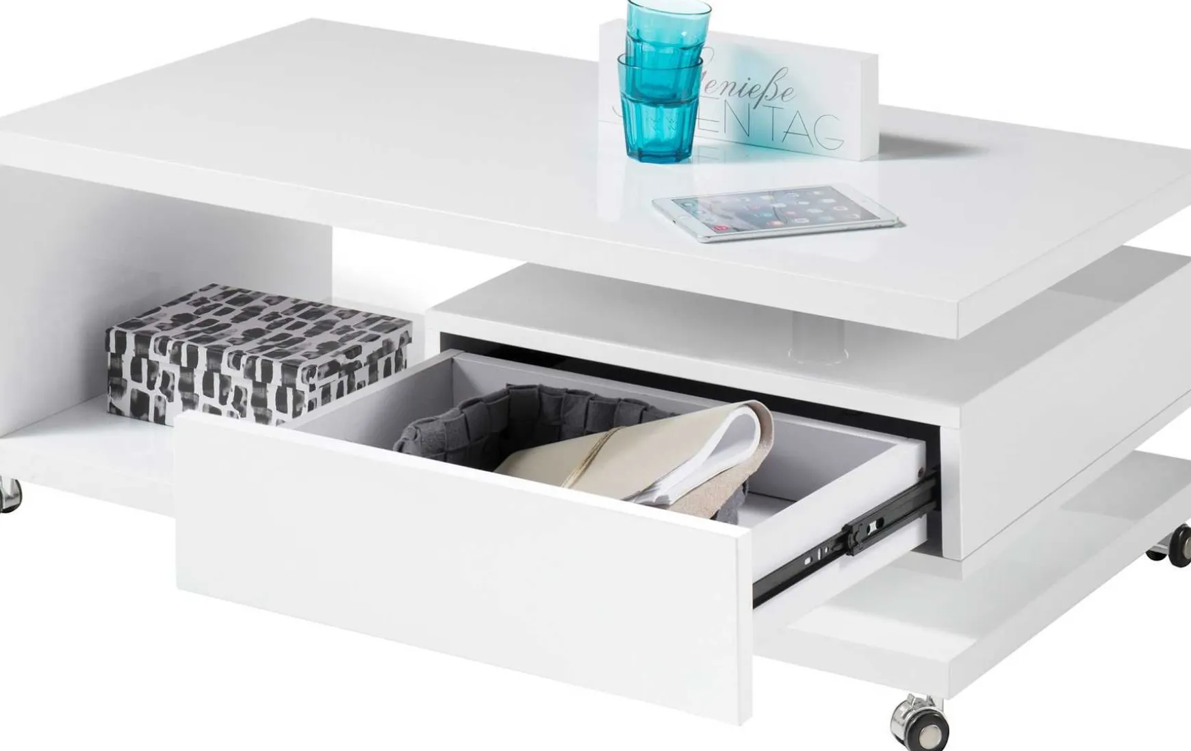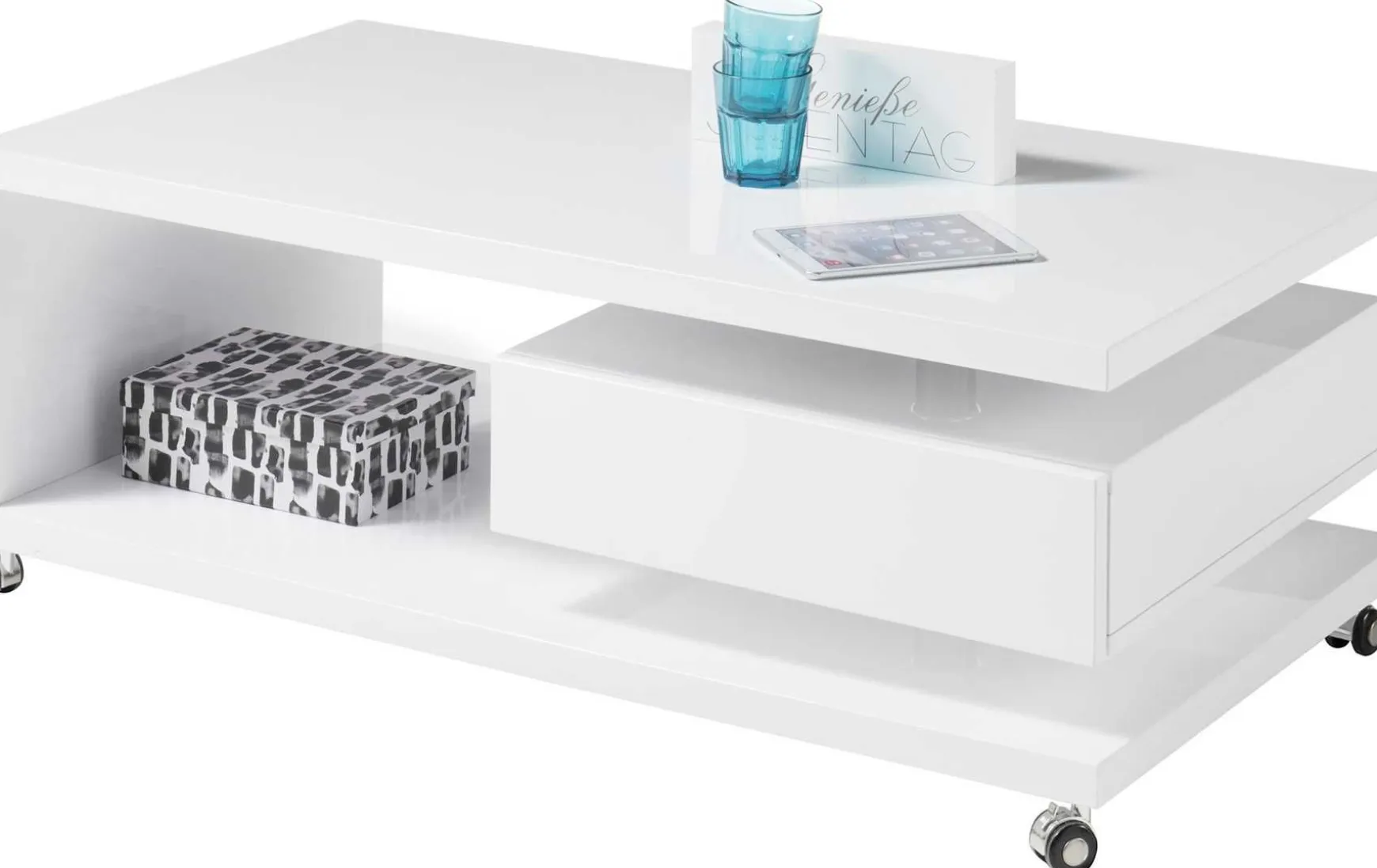 Dieser moderne Couchtisch in Weiß überzeugt durch sein praktisches und zugleich elegantes Design. Die hochglanzlackierte Tischplatte verleiht ihm eine moderne Optik, während die integrierte Ablagefläche sowie eine Schublade viel Stauraum für Zeitschriften, Fernbedienungen oder andere Alltagsgegenstände bieten. Dank der vier Rollen ist der rechteckige Couchtisch flexibel beweglich und lässt sich mühelos im Raum verschieben. Mit seinen Maßen von ca. 110 × 59,5 × 41 cm passt er ideal in moderne Wohnbereiche und lässt sich leicht pflegen.