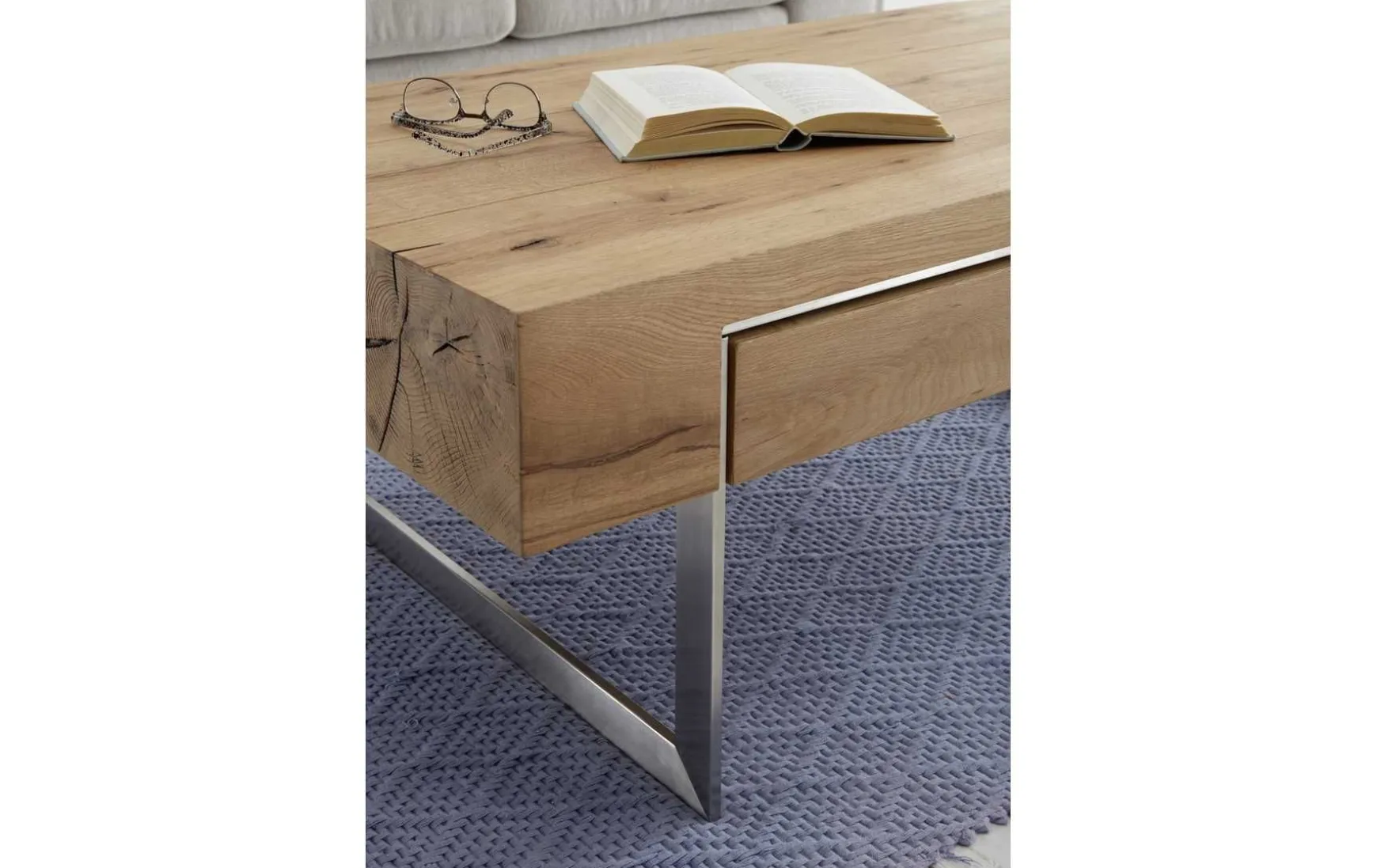 Hier tragen schmale Metallkufen in Edelstahl-Optik, die üppige Holzplatte. Dabei handelt es sich um furniertes Asteichenholz.