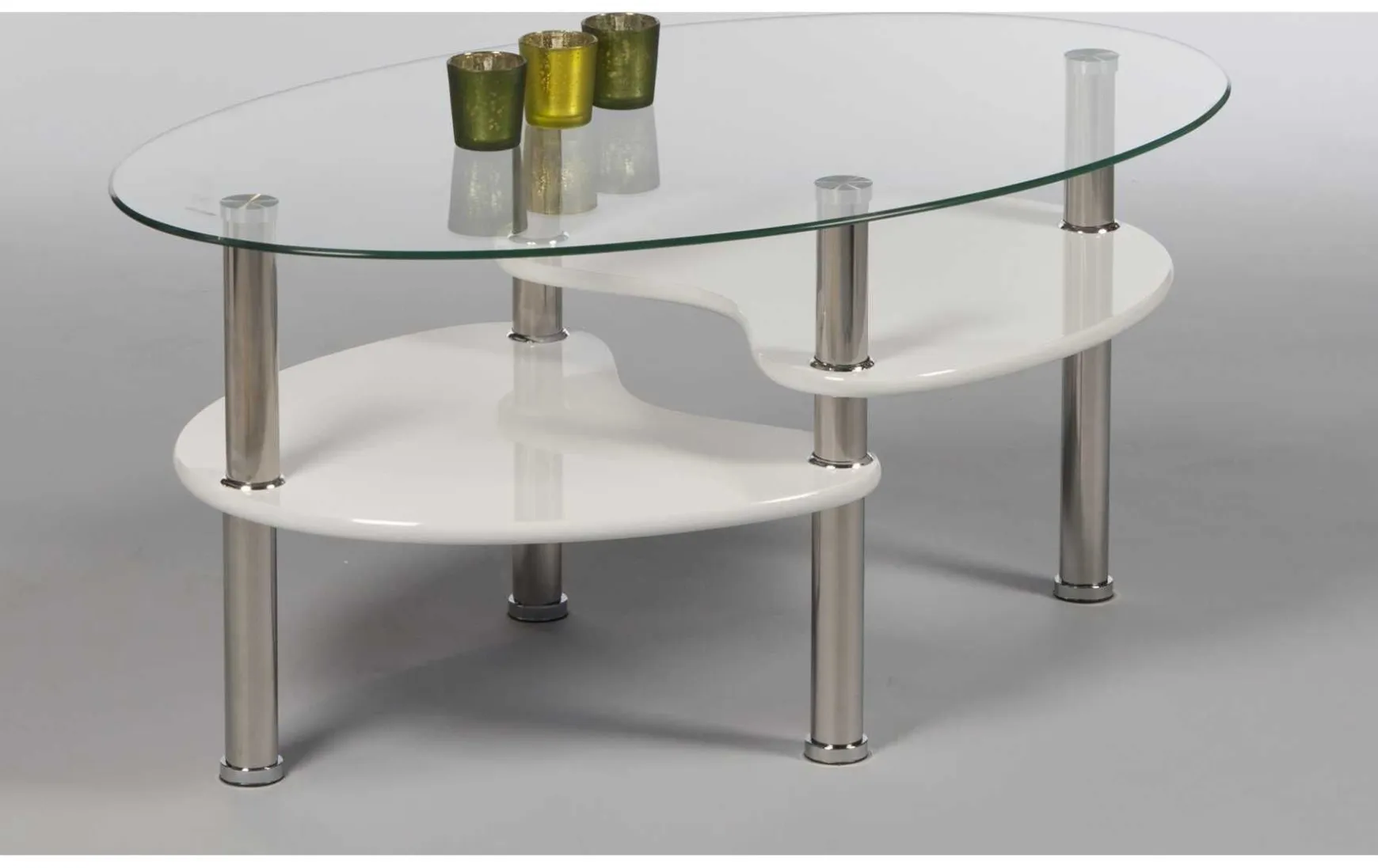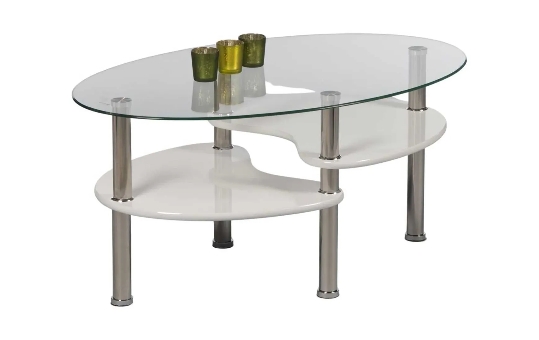 Dieser moderne Couchtisch überzeugt durch sein elegantes und zugleich funktionales Design. Die ovale Klarglas-Tischplatte verleiht dem Tisch eine leichte, zeitgemäße Optik, während zwei zusätzliche Ablageflächen aus weiß lackiertem MDF praktischen Stauraum bieten. Das Gestell aus Edelstahl sorgt für Stabilität und einen edlen Look. Mit Maßen von ca. 90 × 55 × 42 cm (B/T/H) ist der pflegeleichte Couchtisch ideal für moderne Wohnräume und wird zerlegt geliefert.