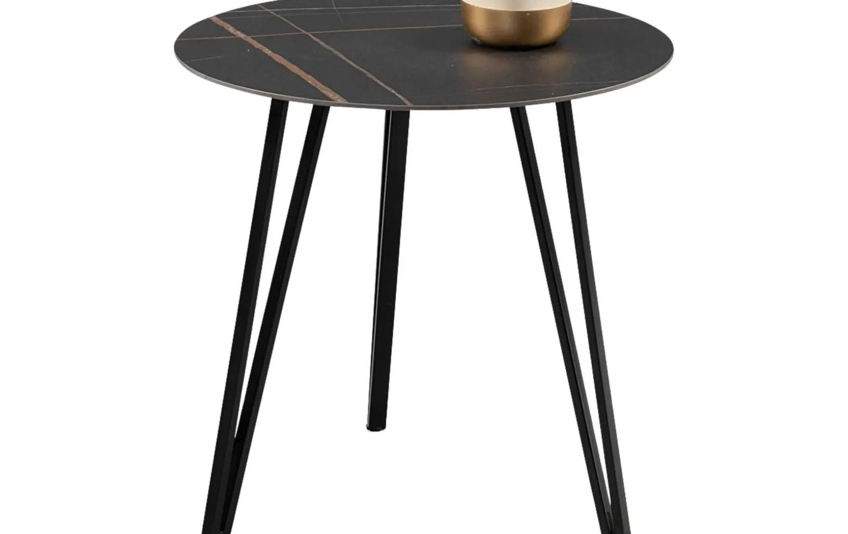 Dieser moderne Couchtisch überzeugt mit einer eleganten, dunklen Keramik-Deckplatte und einem schlanken schwarzen Metallgestell. Durch sein rundes, kompaktes Design eignet er sich ideal als stilvolle Ablage im Wohnzimmer und fügt sich harmonisch in moderne Wohnkonzepte ein.
