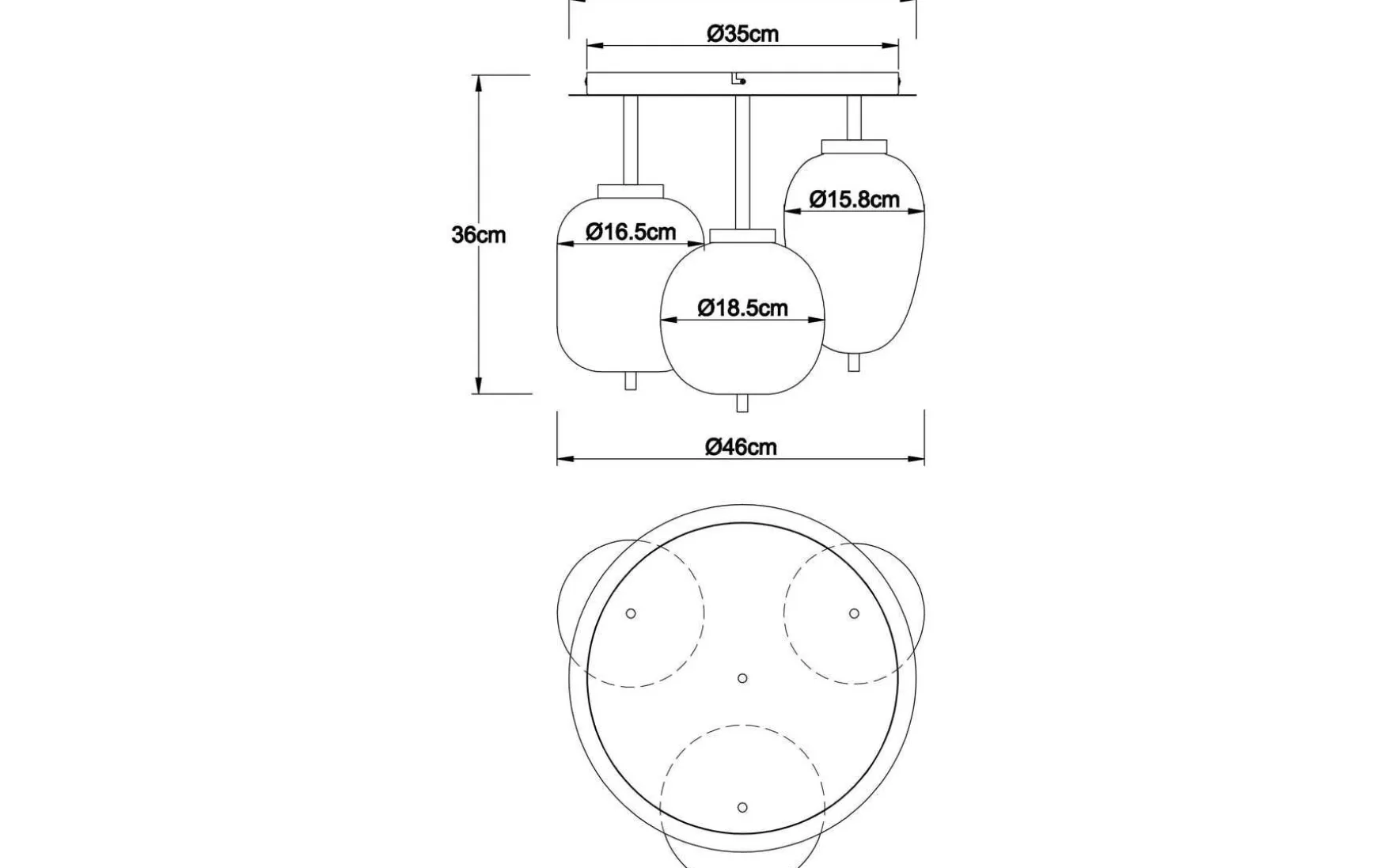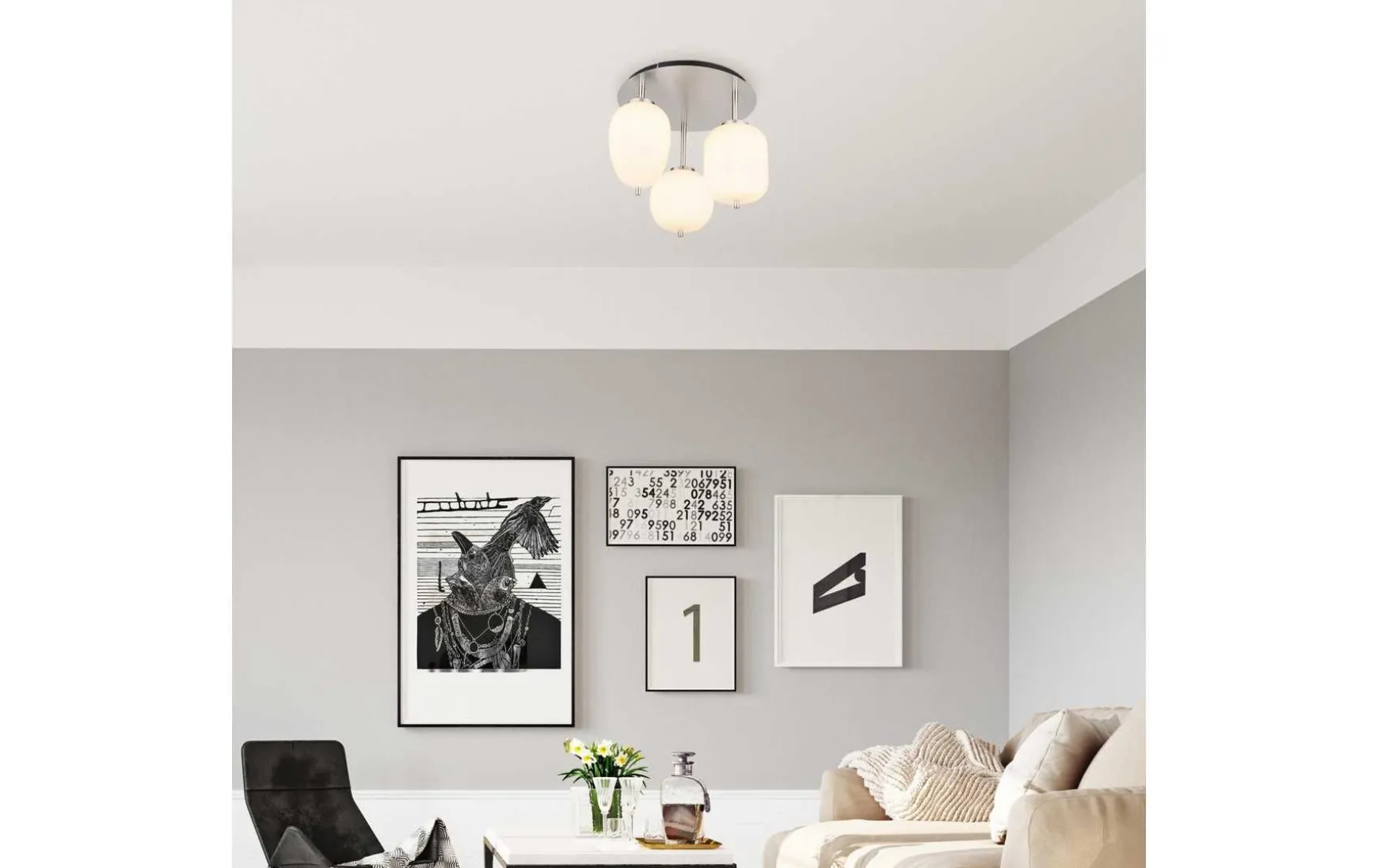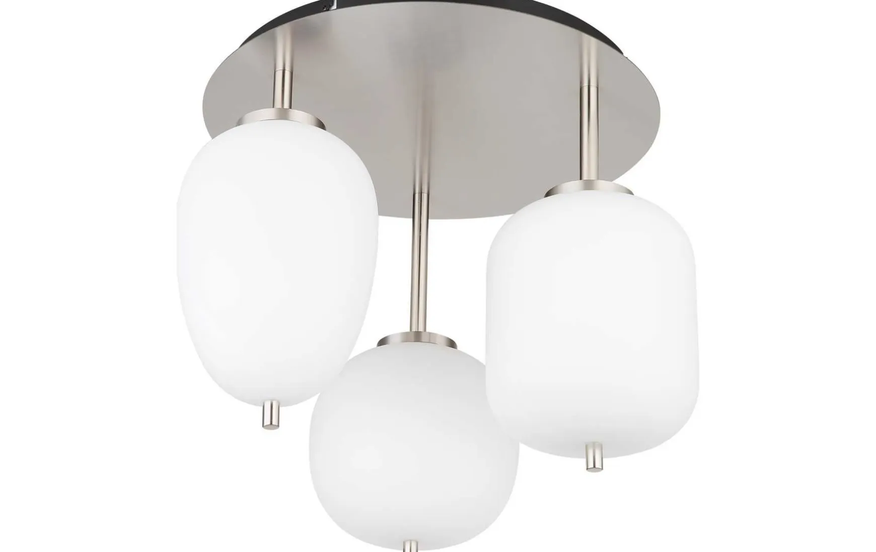 Diese tolle Deckenleuchte begeistert durch Ihr schönes Design. Drei E14 Fassungen befinden sich unter jeweils einem opalen Glasschirm in unterschiedlichen Formen, welche an nickelfarbenen Metallstangen auf einem Sockel 36 cm von der Decke hängen (Ø46cm). Die E14 Fassungen ermöglichen Ihnen die freie Auswahl, bis zu einer maximalen Leistung von 40 Watt, zu benutzen.