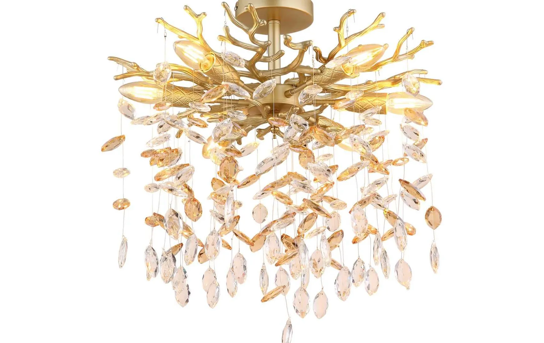 Diese runde Deckenleuchte mit edlem Kristallbehang Die runde Deckenleuchte begeistert mit ihrem kunstvollen Design und bringt stilvollen Glanz in Ihr Zuhause. Der fein verzweigte Korpus aus matt goldfarbenem Metall erinnert an ein zartes Geäst und wird durch funkelnde Glaskristalle in Amber und Klar veredelt. Diese Kombination sorgt für faszinierende Lichtreflexe und verleiht jedem Raum eine elegante, warme Atmosphäre. Dank der Flexo-Elemente an den Fassungen lassen sich die Lichtquellen individuell ausrichten, um gezielte Lichtakzente zu setzen. die Lampe ist mit mehreren E14-Fassungen ausgestattet und eignet sich ideal für Wohn-, Ess- oder Schlafbereiche. Die Leuchtmittel sind nicht im Lieferumfang enthalten, wodurch Sie Ihre persönliche Lichtwirkung frei wählen können. Sie ist nicht nur eine Lichtquelle, sondern ein ausdrucksstarkes Wohnaccessoire mit Charakter. Leuchtmittel E14 sind nicht enthalten
