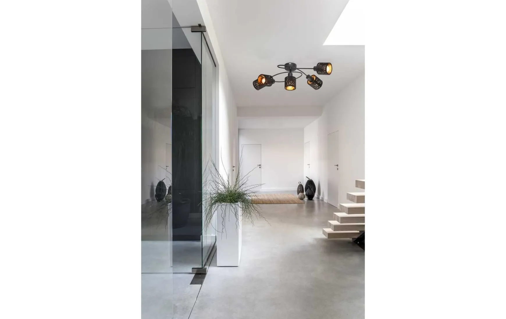 Das schwarze Metall der Arme und Halterung ergänzt das Bild und machen diesen Deckenstrahler zu einem wahren Hingucker.