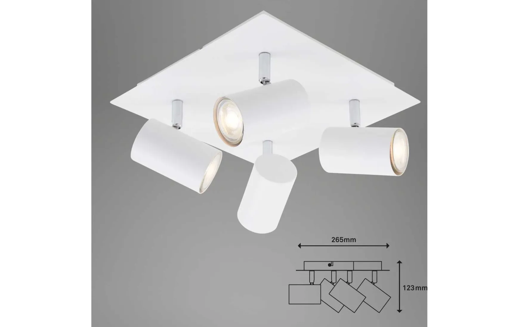 Moderner 4-flammiger Deckenspot in weiß, gefertigt aus Metall. Durch die dreh- und schwenkbaren Spots lässt sich das Licht individuell steuern. Durch ihr elegantes Design ist die Deckenlampe vielseitig einsetzbar, z.B. als Wohnzimmerlampe oder Schlafzimmerlampe