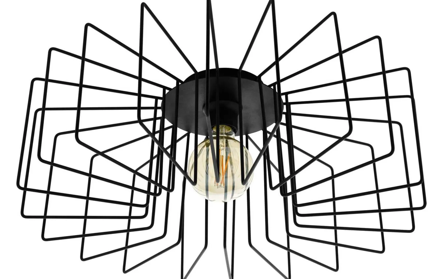 Diese Deckenleuchte ist aus einem schwarzen Draht-Körper gefertigt, der sich wie ein Mantel um das Leuchtmittel legt.