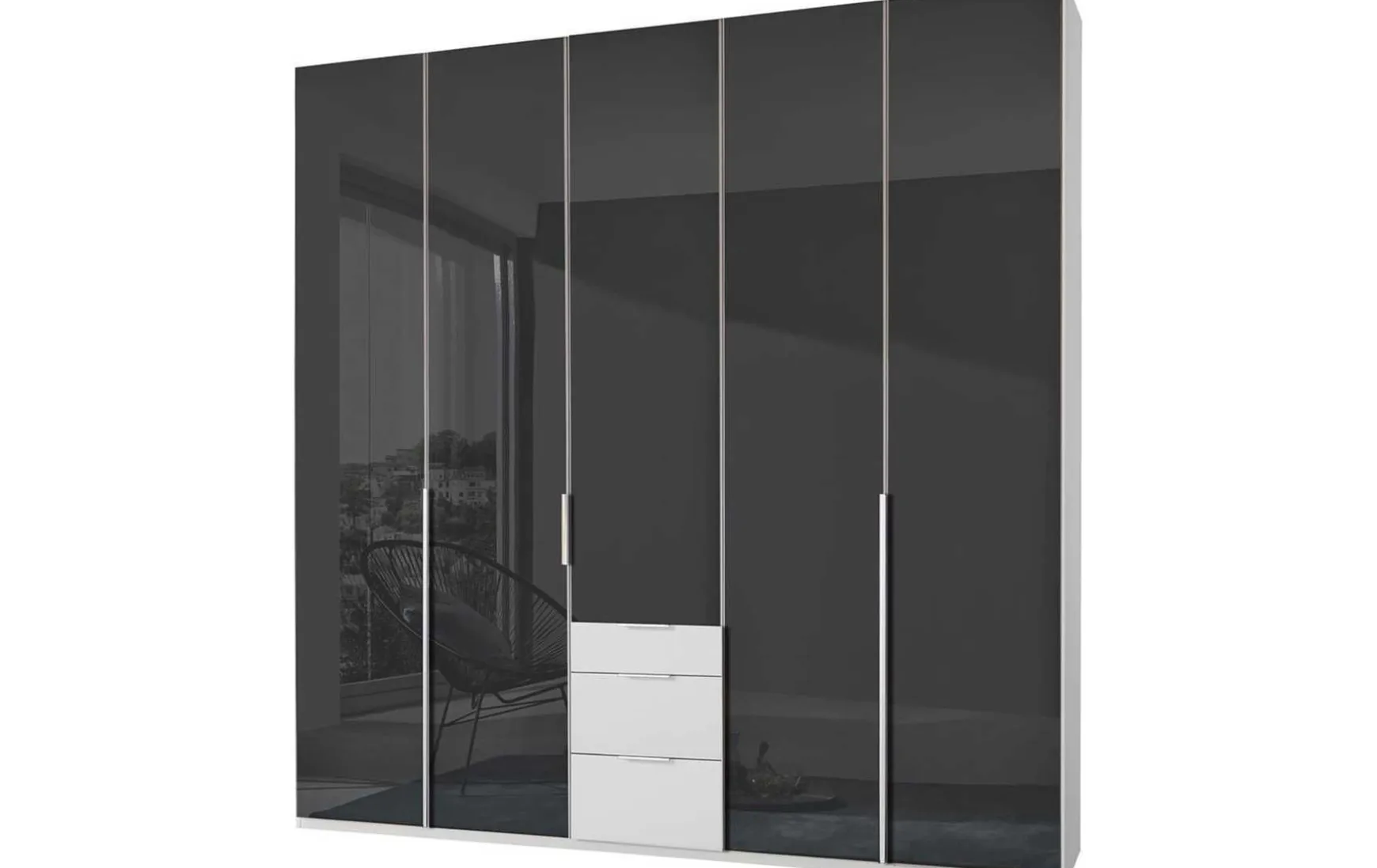 Dekorativ und hochfunktional zugleich ist dieser moderne Kleiderschrank. Er wird das Ambiente im Schlafzimmer durch seine attraktive Farbe und der pflegeleichten Kunststoffoberflächen bereichern. Der 5-türige Kleiderschrank mit seinen Fronten in Glas Grey verleiht Ihrem Schlafzimmer einen edlen Touch. Die 3 Laden in weiß bieten zusätzlichen Stauraum und helfen Ihnen, Ordnung und Übersicht in Ihr Schlafzimmer zu bringen. Ausgestattet ist der Schrank mit 5 Fachböden und 2 Kleiderstangen. Weitere Innenausstattungen sind zum individuellen Preis erhältlich.