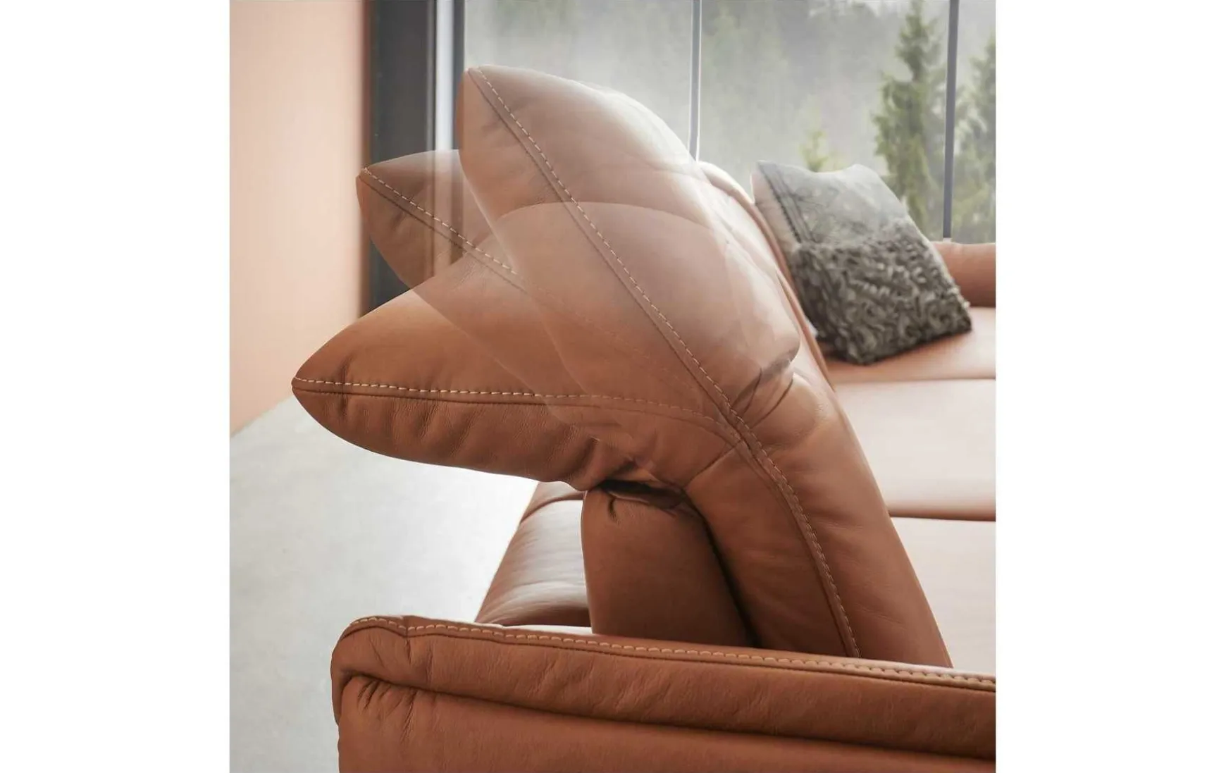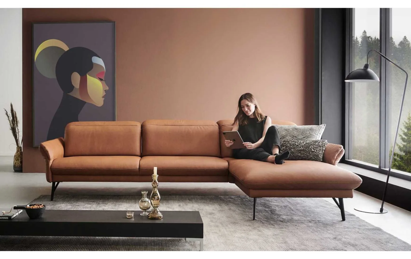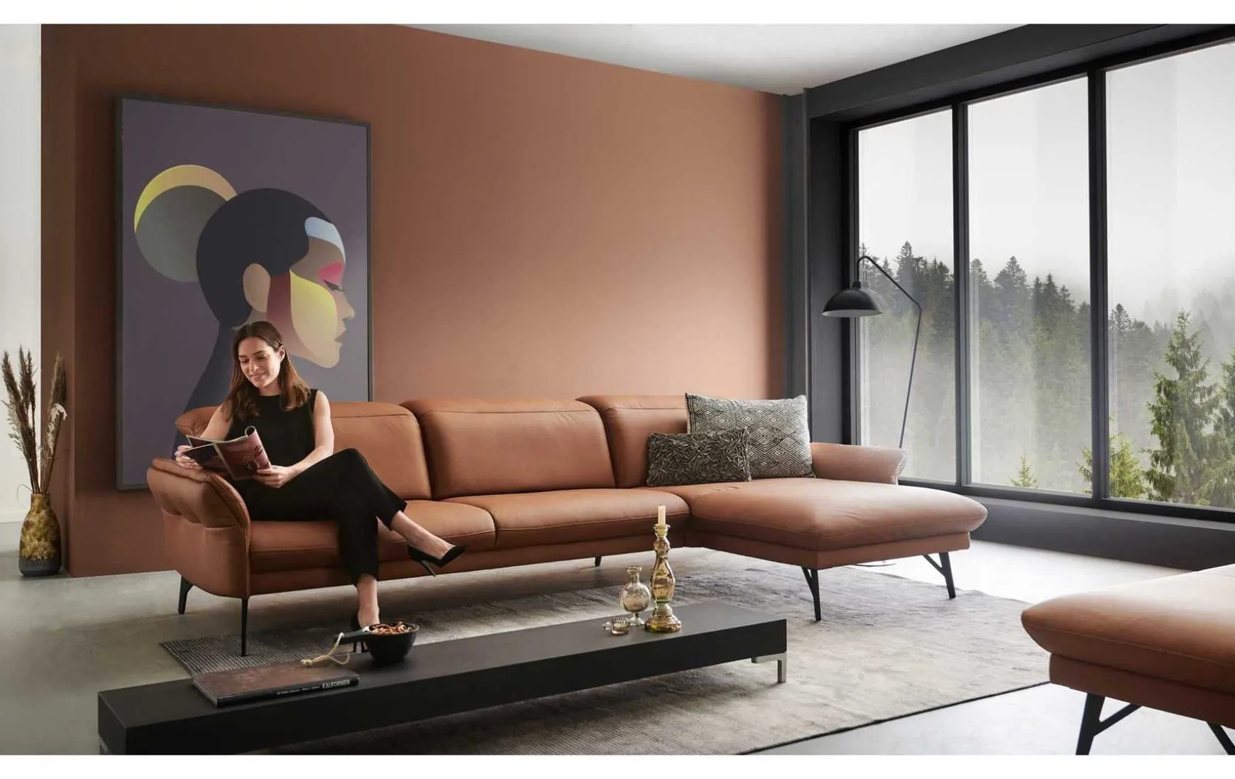 Diese Polsterecke begeistert mit erstklassigen Materialien, herausragendem Sitzkomfort und extravagantem Design. Für die stabile Basis der Couch sorgen die anthrazitfarbenen Metallfüße. Der Sitzbereich ist wie der Rücken mit braunem LongLife-Leder bezogen. Durch die gelungene Material- und Farbkombination strahlt die erstklassig verarbeitete Wohnlandschaft außergewöhnlich kreative Eleganz aus – er verleiht jeder Wohnzimmereinrichtung das gewisse Etwas und zieht die Blicke auf sich. Die Garnitur setzt sich aus einem 2,5-Sitzer mit Armteil links und einer Abschlussrecamiere mit Armteil rechts zusammen. Die Armlehnen und die Kopfteile sind manuell in Höhe und Neigungswinkel verstellbar