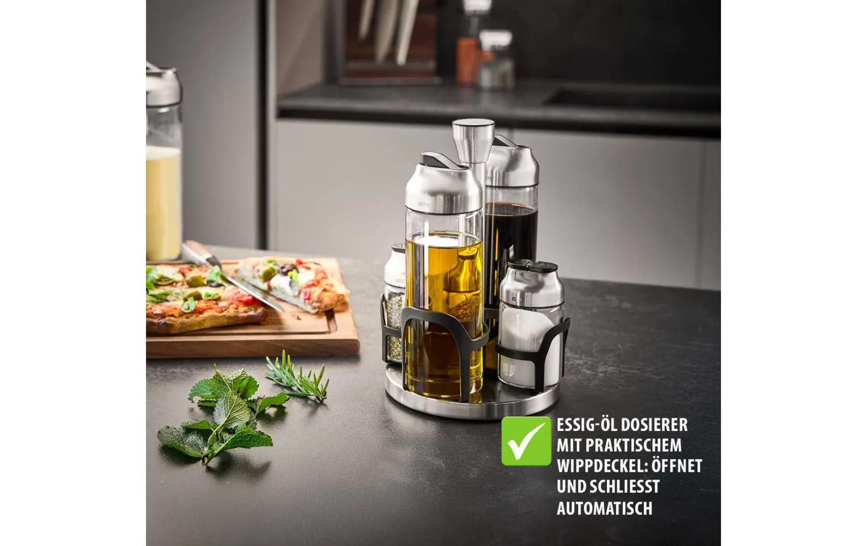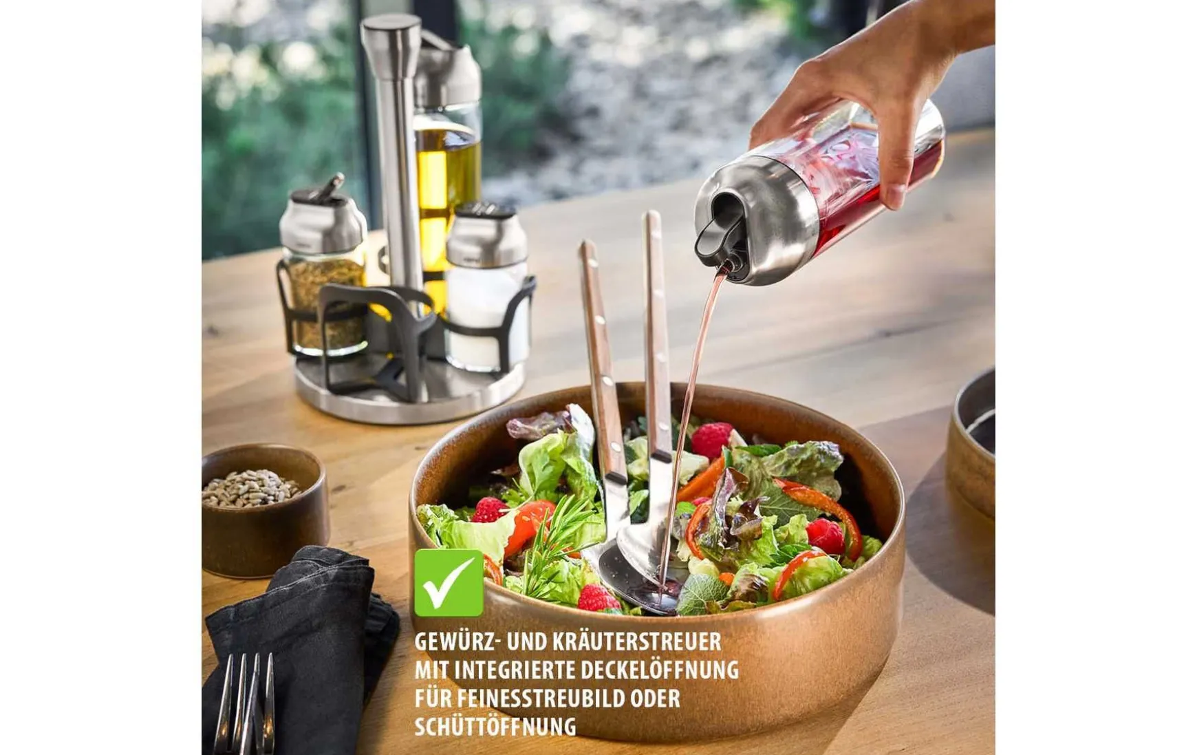 - 2 Gewürz- und Kräuterstreuer sowie 2 Essig-Öl Dosierer und ein Drehkarussell