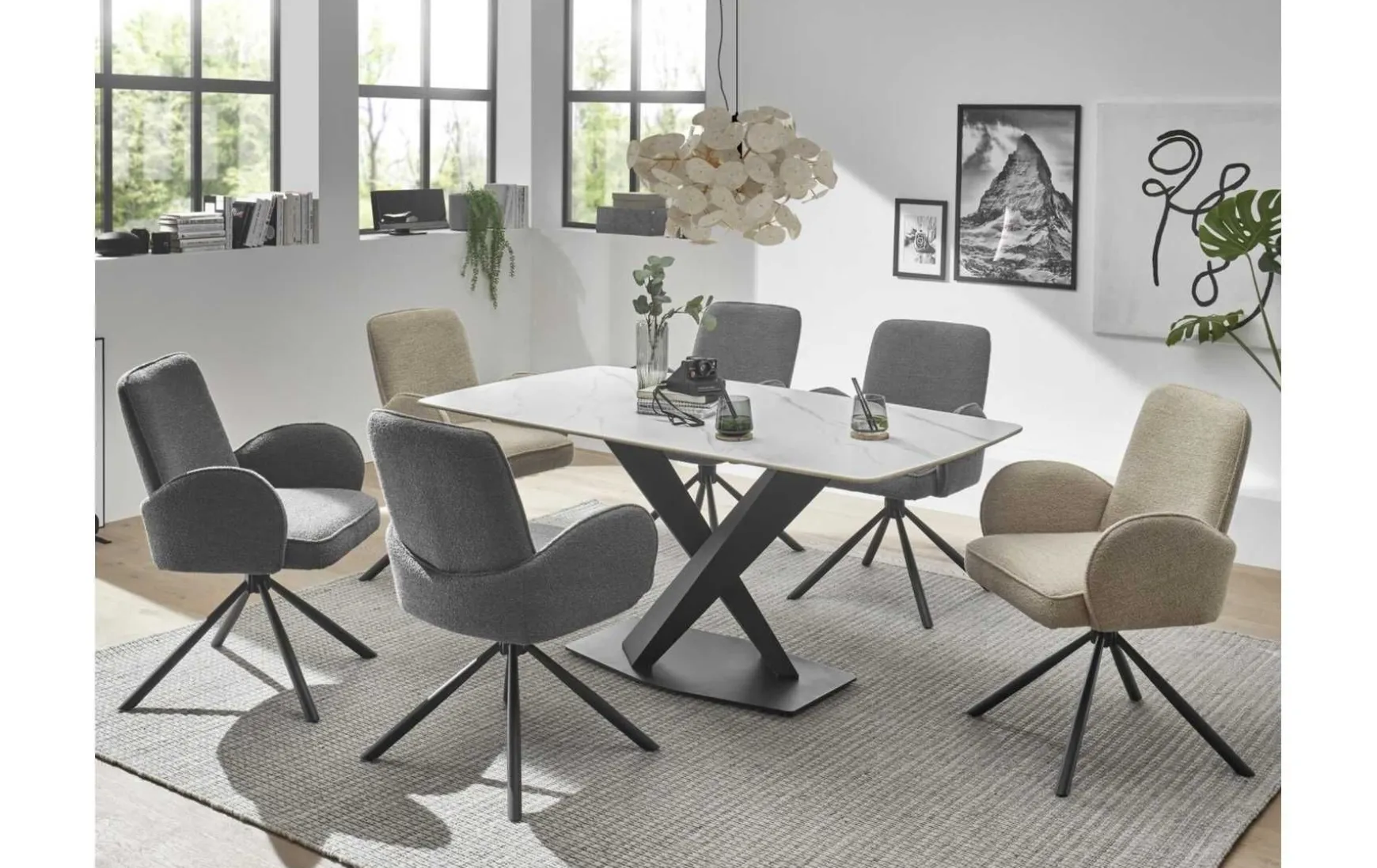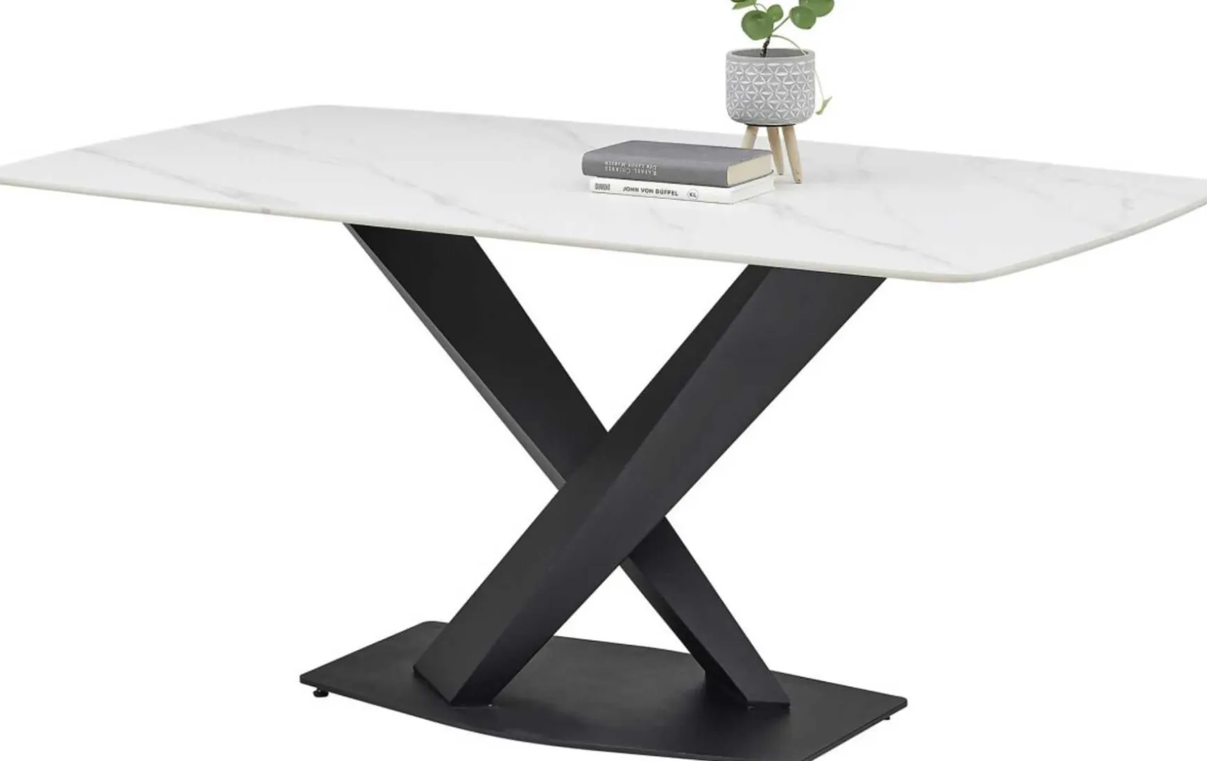 Dieser Esstisch überzeugt durch modernes Design und hochwertige Materialien und wird zum stilvollen Mittelpunkt in jedem Essbereich. Die rechteckige Tischplatte in eleganter weißer Marmoroptik aus Keramik verleiht dem Tisch eine edle Ausstrahlung und ist zugleich robust sowie pflegeleicht. Mit seinen Maßen von ca. 180 x 75 x 90 cm (B/H/T) bietet der Esstisch ausreichend Platz für gemeinsame Mahlzeiten und gesellige Runden. Das stabile, x-förmige Metallgestell in Schwarz sorgt für einen sicheren Stand und setzt einen markanten, modernen Akzent. Abgerundete Ecken erhöhen die Sicherheit und unterstreichen das harmonische Gesamtbild. Der Esstisch Ventura wird zerlegt geliefert und lässt sich dank verständlicher Montageanleitung einfach und schnell aufbauen.