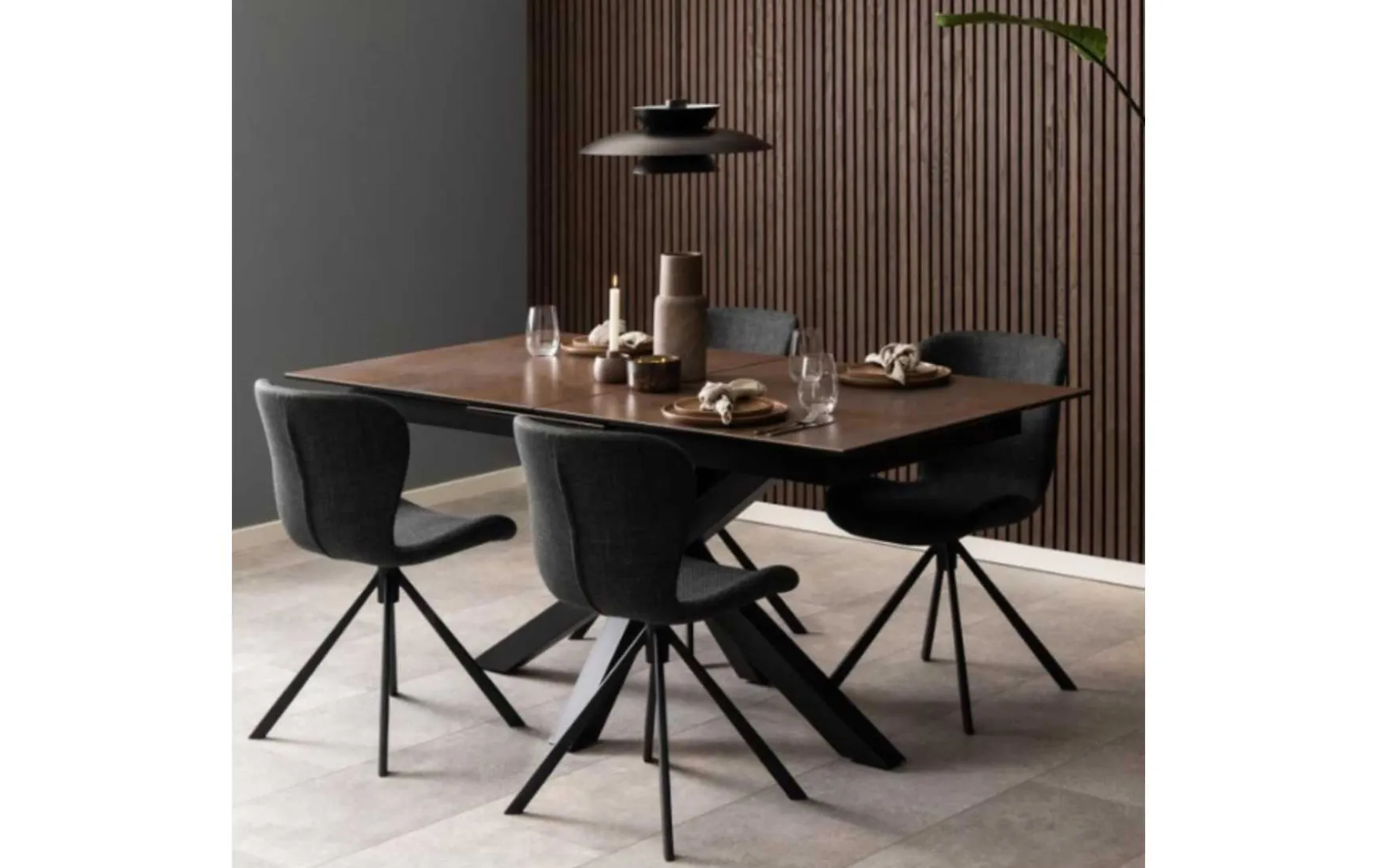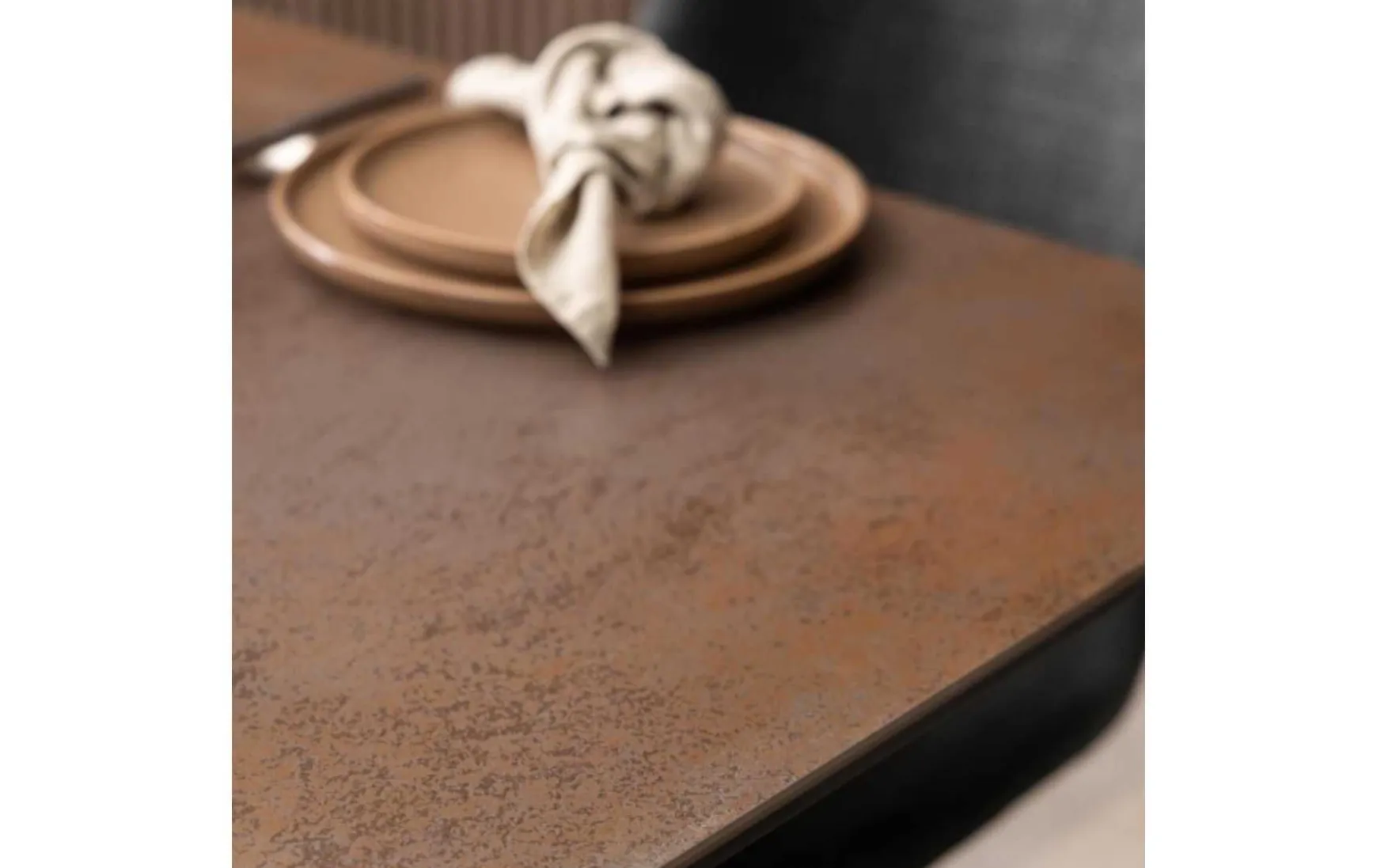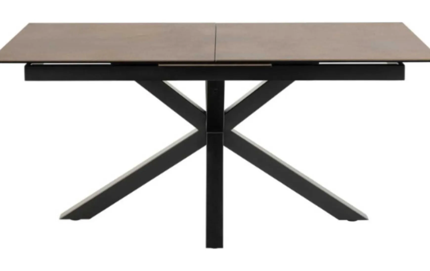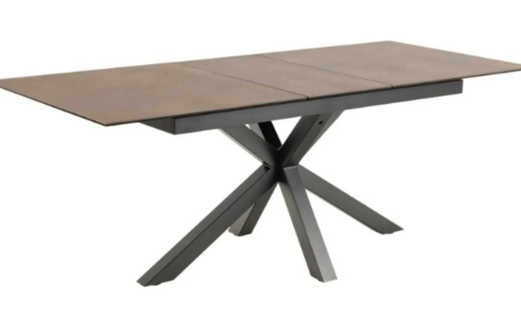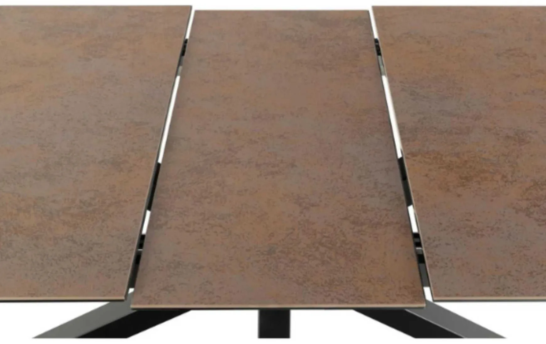 Der rechteckige Esstisch ist ein schönes Stück, das in jedes moderne Esszimmer passt. Die Platte ist aus rostbrauner Keramik gefertigt und verleiht Ihrem Raum einen Hauch von Eleganz und Wärme. Das Kreuzgestell aus mattschwarz pulverbeschichtetem Stahl sorgt für Stabilität und Langlebigkeit. Eine der auffälligsten Eigenschaften dieses Tisches ist seine ausziehbare Platte, die ihn perfekt für Gäste oder große Versammlungen macht.