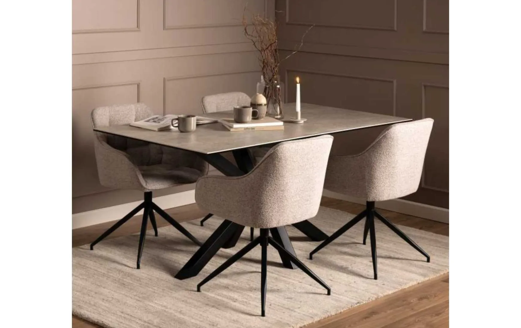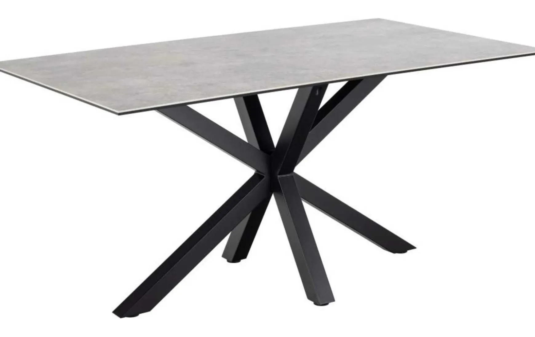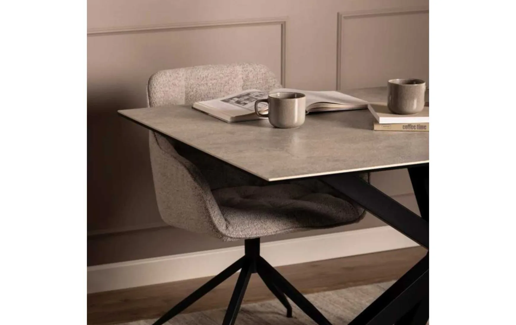 Der rechteckige Esstisch ist eine stilvolle und moderne Wahl für jedes Esszimmer. Die Platte hat eine schöne graue, raue Anista-Keramikoberfläche, die sowohl langlebig als auch leicht zu reinigen ist. Das Untergestell ist aus mattschwarzem, pulverbeschichtetem Stahl gefertigt und verleiht dem Design Stabilität und einen modernen Touch. Mit den Maßen ca. 160x90x76 cm ist dieser Tisch perfekt für Familienessen oder Dinnerpartys.