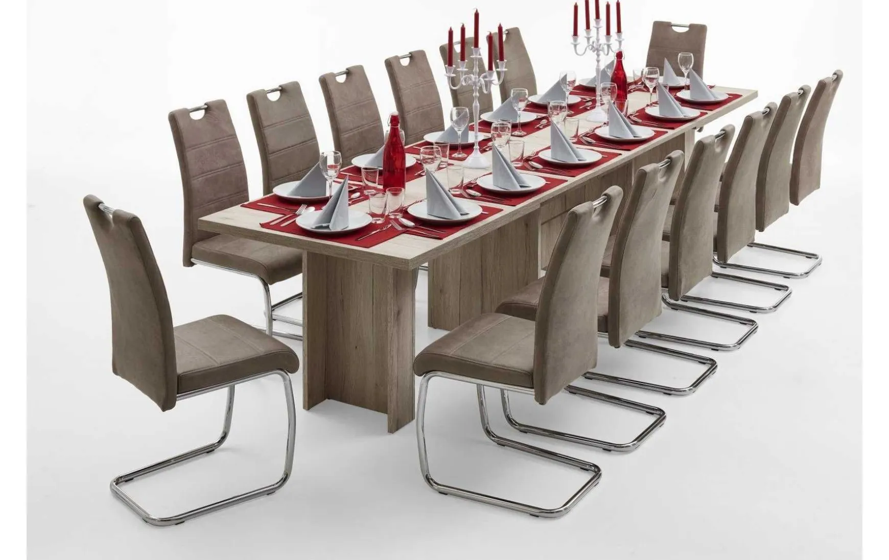 Der moderne Kulissentisch in Sandeiche Dekor, ist mit einem sehr praktischen mittigen Synchron-Auszug und 4 Einlegeplatten versehen, um bei Bedarf die gewünschte Fläche zu erweitern. Dank den innenliegenden Einlegeplatten ist eine Erweiterung dieses Esstisches von 160 x 90 cm auf 320 x 90 cm möglich.