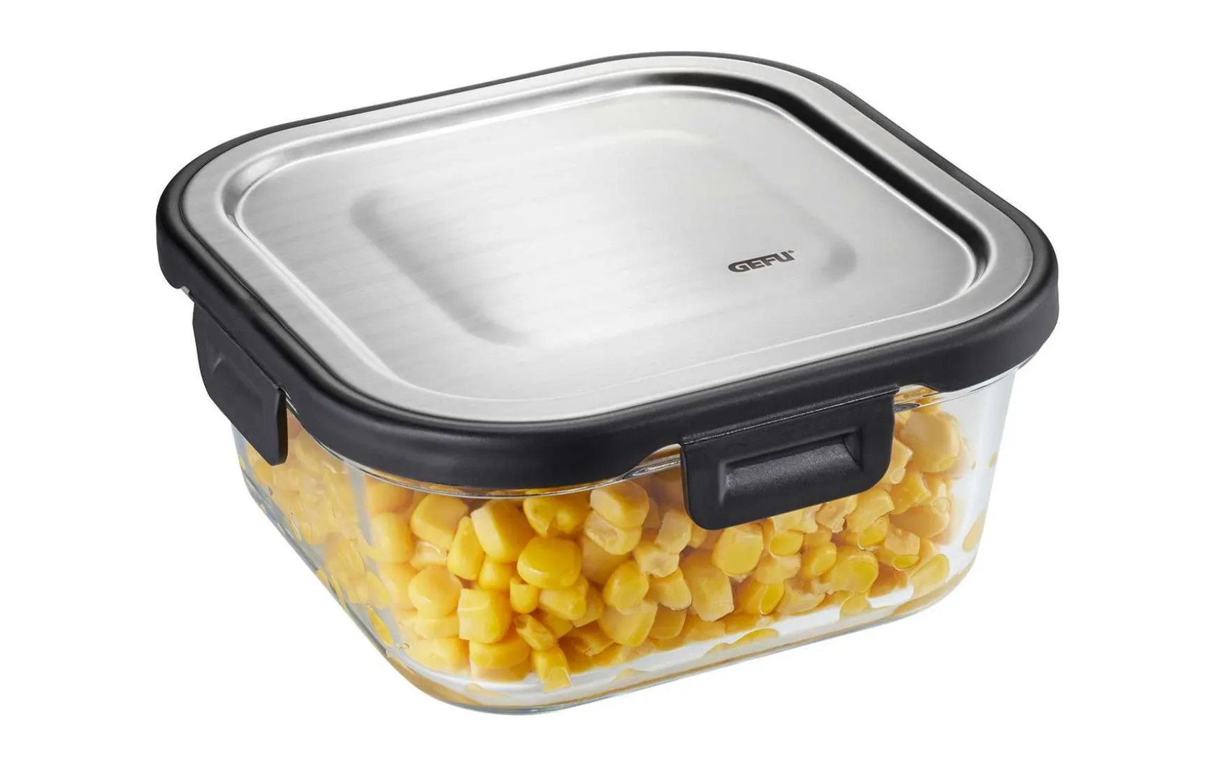 • hochwertiger Borosilikatglasbehälter mit Deckel aus Edelstahl