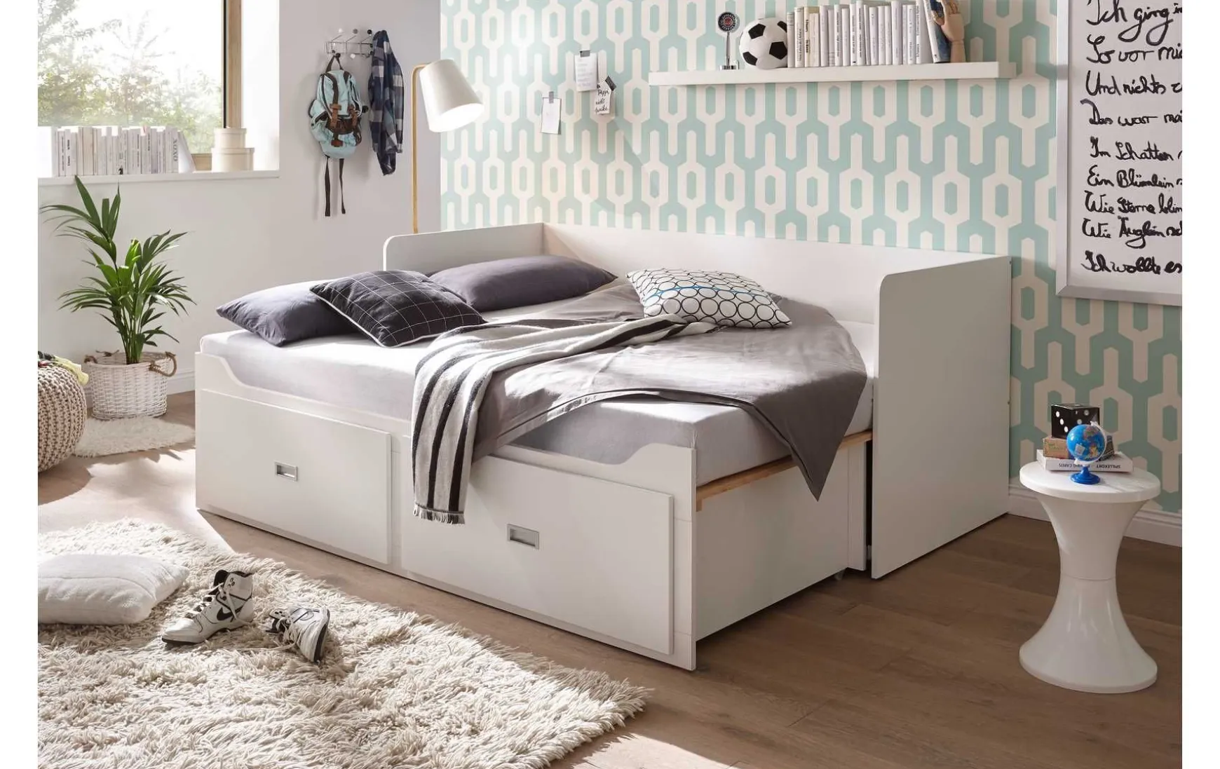 Dieses vielseitige Funktionsbett ist die perfekte Lösung für flexible Wohn- und Schlafkonzepte im Kinder- oder Jugendzimmer. Ausgestattet mit einer komfortablen Doppelmatratze und einem stabilen Lattenrost bietet das Bett sofortigen Schlafkomfort. Dank der ausziehbaren Liegeflächen lässt sich das Jugendbett im Handumdrehen von 90 × 200 cm auf großzügige 160 × 200 cm erweitern – ideal für Übernachtungsgäste oder Geschwister. Zwei integrierte Schubladen schaffen zusätzlichen Stauraum für Bettwäsche, Kissen oder Spielzeug und sorgen für Ordnung im Alltag. Ein durchdachtes Bettkonzept, das Funktionalität, Komfort und Platzersparnis vereint.