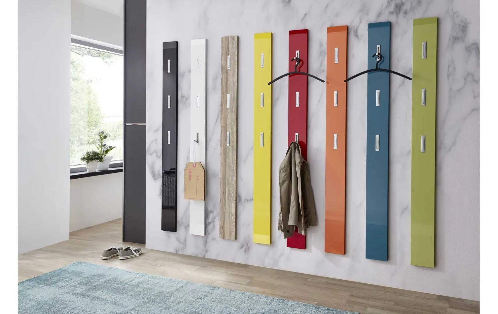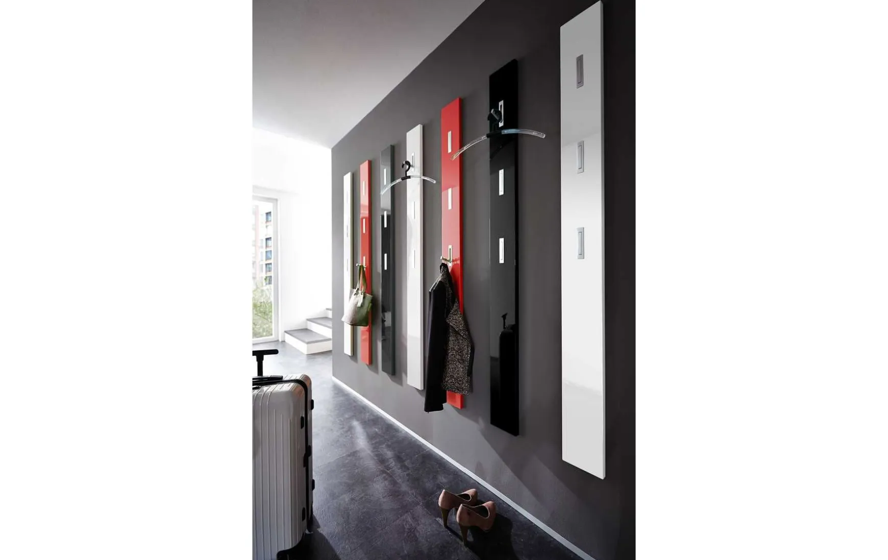 Das moderne Garderobenpaneel überzeugt durch sein schlankes, platzsparendes Design und setzt mit der Front in Rot Hochglanz einen stilvollen Akzent im Eingangsbereich. Die drei integrierten Klapphaken bieten praktische Aufhängemöglichkeiten für Jacken, Taschen oder Accessoires und lassen sich bei Nichtgebrauch dezent einklappen. Durch die schmale Bauweise eignet sich das Paneel besonders gut für kleine Flure oder schmale Wandflächen.