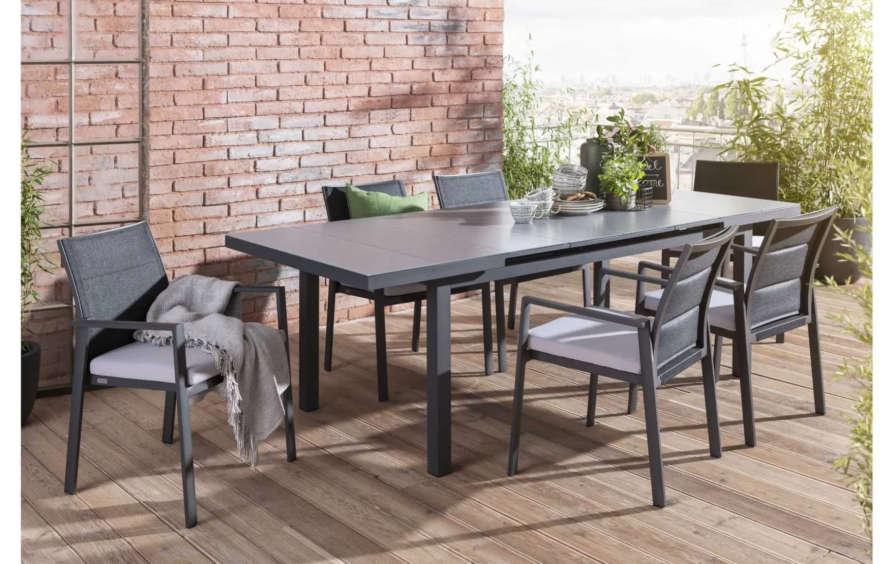 Sehr gut verarbeitete Materialien machen diesen Tisch zu einem hochwertigen Highlight in Ihrem Garten. Pulverbeschichtetes Aluminium wurde hier in Anthrazit gehalten. Sie haben spontan mehr Besuch erhalten? Kein Problem! Mit einem Handgriff lässt sich der Tisch von 180 auf 240 cm ausziehen, dank seiner tollen und einfachen Mechanik.