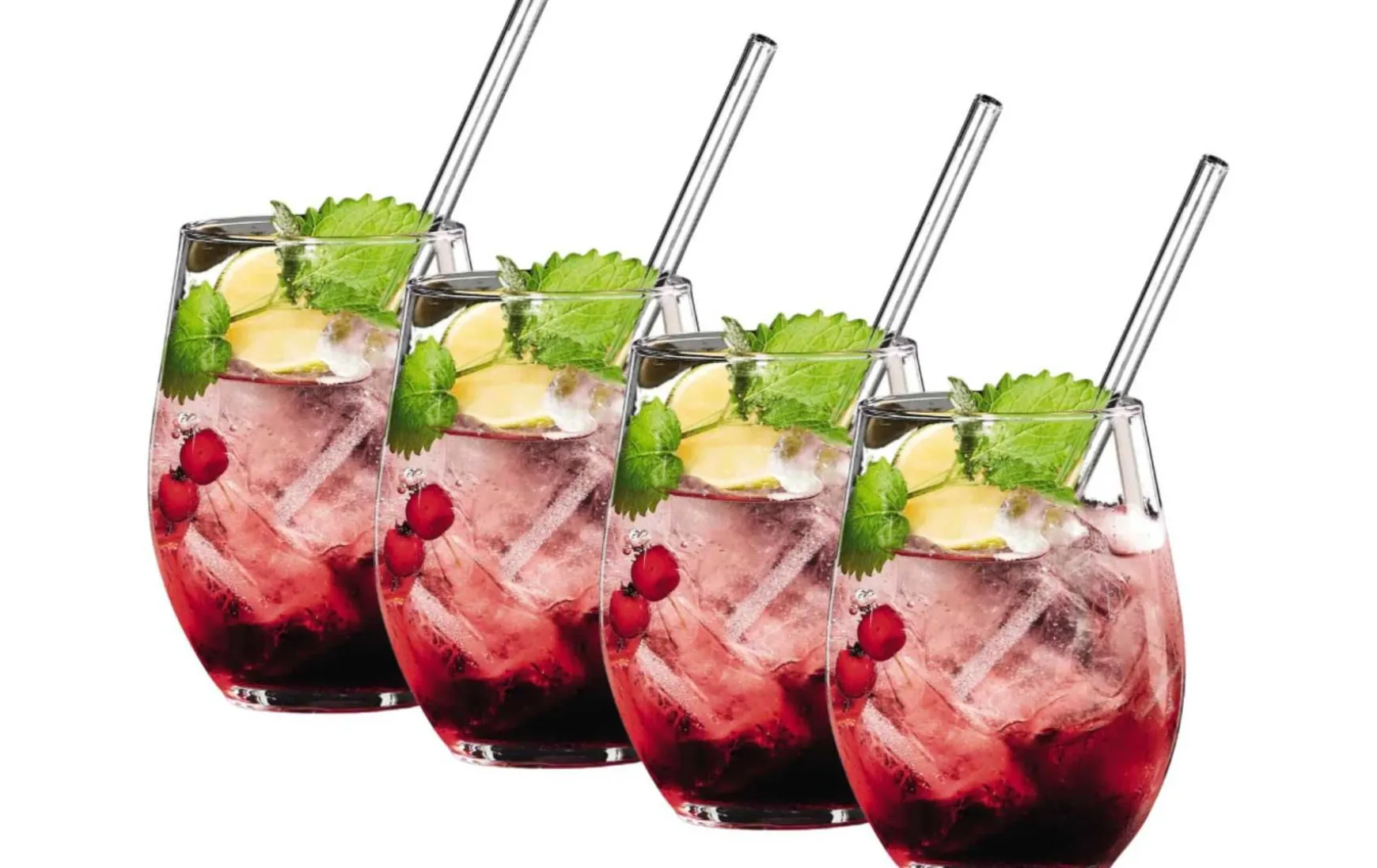 Das elegante Gläserset 8-tlg. kommt inklusive vier Glastrinkhalmen (20 cm). Die bauchigen Klarglasgefäße eignen sich für alle Gin-Mixturen oder auch diverse Säfte. Zum Set gehören vier spülmaschinenfeste Gläser mit je je 590 ml Füllmenge.