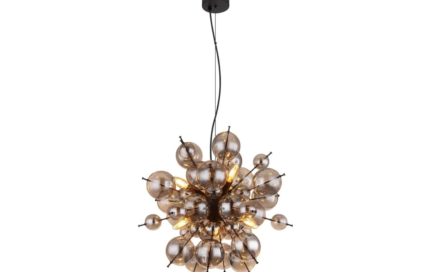 Diese Hängeleuchte vereint ein elegantes Design mit moderner Ästhetik und setzt stilvolle Akzente in Ihrem Zuhause. Die runde Form der Hängeleuchte wird durch Stäbe mit unterschiedlich großen Kugeln gekonnt in Szene gesetzt. Der Korpus der Hängeleuchte besteht aus mattem schwarzem Metall und verleiht ihr eine zeitlose Eleganz. Der Schirm der Hängeleuchte besteht aus rauchfarbenen Glaskugeln, die eine sanfte und angenehme Beleuchtung erzeugen. Mit einem Durchmesser von 550mm sorgt diese Hängeleuchte für eine großzügige Ausleuchtung Ihres Raumes. Die Hängeleuchte kann einfach an der Decke montiert werden und bietet ein blendfreies Licht. Ob im Wohnzimmer, Essbereich oder Flur, diese Hängeleuchte verleiht jedem Raum eine einladende Atmosphäre. Mit ihrem ansprechenden Design und hochwertiger Verarbeitung ist die Hängeleuchte ein absoluter Blickfang. Tauchen Sie Ihr Zuhause in ein angenehmes und stilvolles Licht und lassen Sie sich von dieser Hängeleuchte begeistern.