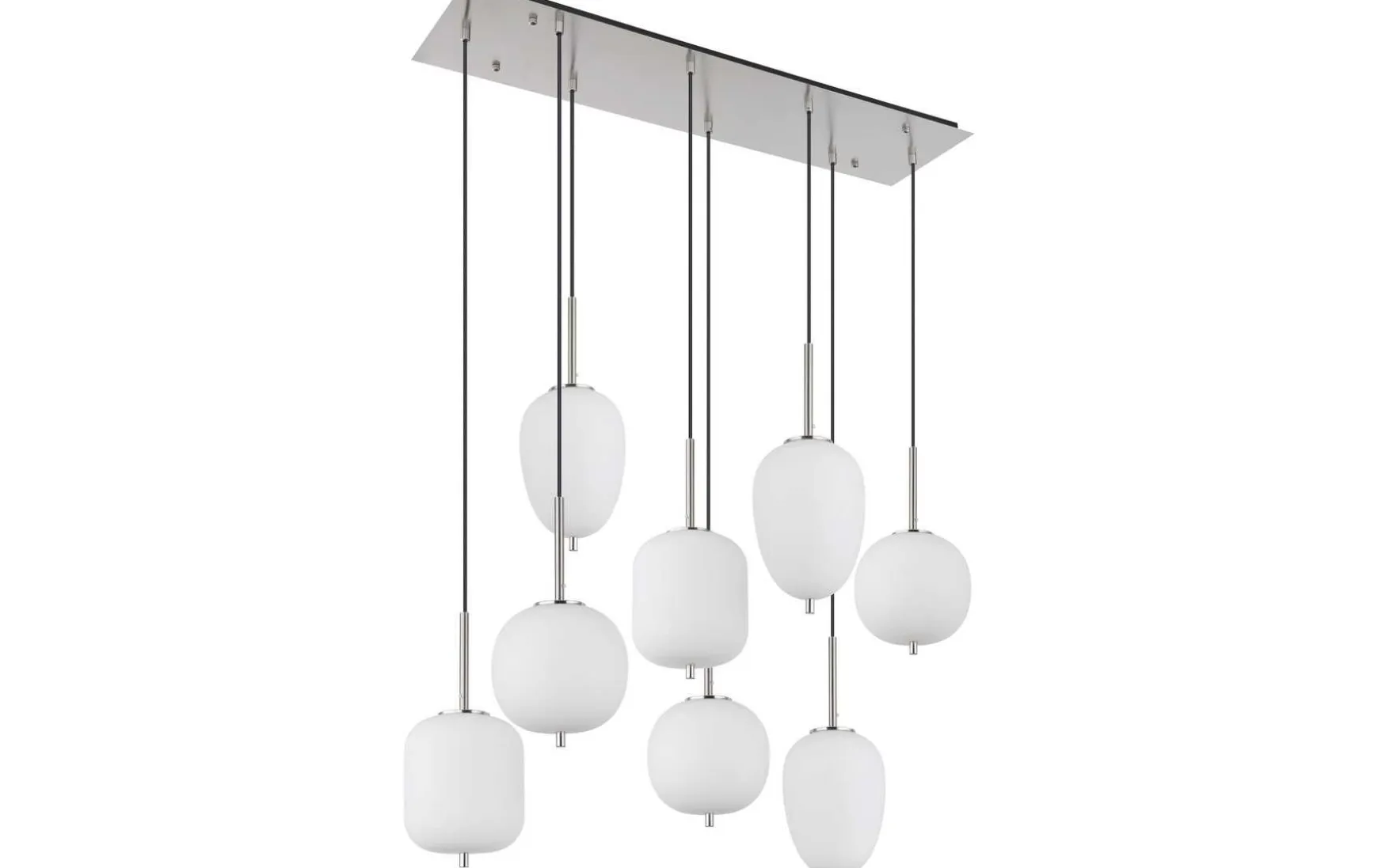 Diese Hängeleuchte besteht aus nickelfarbenen Metall mit opalen Gläsern. Die acht hängenden Gläser sind in ihrer Aufmachung und Größe individuell. Diese 120 cm in den Raum ragende, kunstvolle Lampe verfügt über acht E14 Fassungen (mit max. 40 Watt), die eine freie Leuchtmittelwahl ermöglichen. Aufgrund ihrer Langlebigkeit und Stromersparnis empfehlen wir LED Leuchtmittel. Diese Pendelleuchte eignet sich hervorragend für Ihren Wohn- und Essbereich.