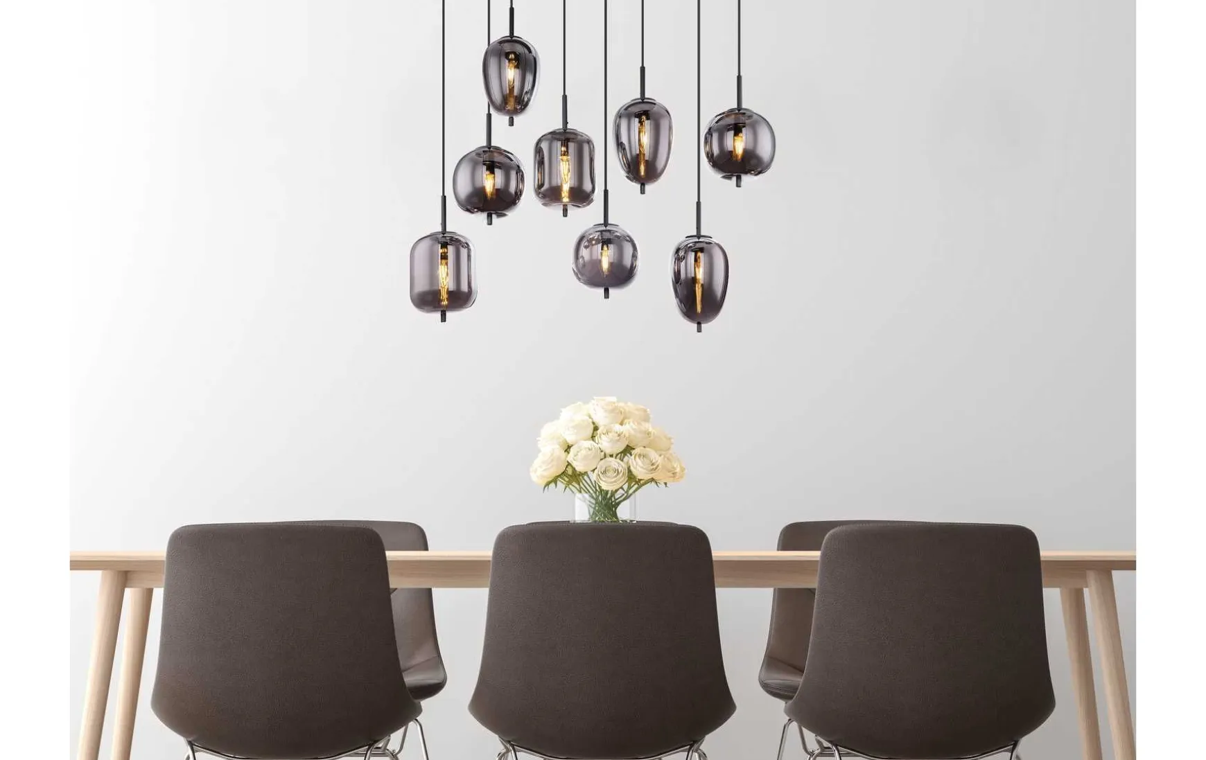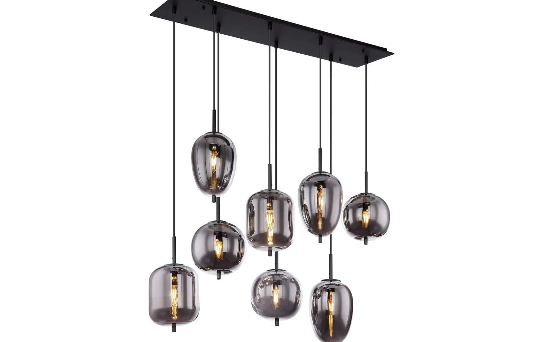 Diese Hängeleuchte besteht aus schwarzem Metall mit rauchfärbigen Gläsern. Die acht hängenden Gläser sind in ihrer Aufmachung und Größe individuell. Diese 120cm in den Raum ragende, kunstvolle Lampe verfügt über acht E14 Fassungen(mit max. 40 Watt), die eine freie Leuchtmittelwahl ermöglichen. Aufgrund ihrer Langlebigkeit und Stromersparnis empfehlen wir LED Leuchtmittel. Diese Pendelleuchte eignet sich hervorragend für Ihren Wohn- und Essbereich.