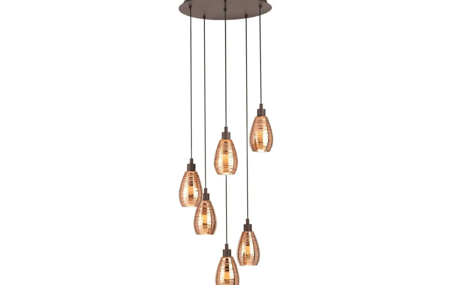 Diese Pendelleuchte ist mit sechs abgerundeten Lampenschirmen aus kupfer-bedampftem Glas gefertigt, die an einem braunen, runden Metall-Baldachin abgehängt wurden.
