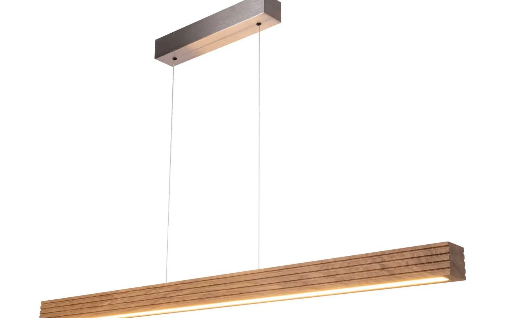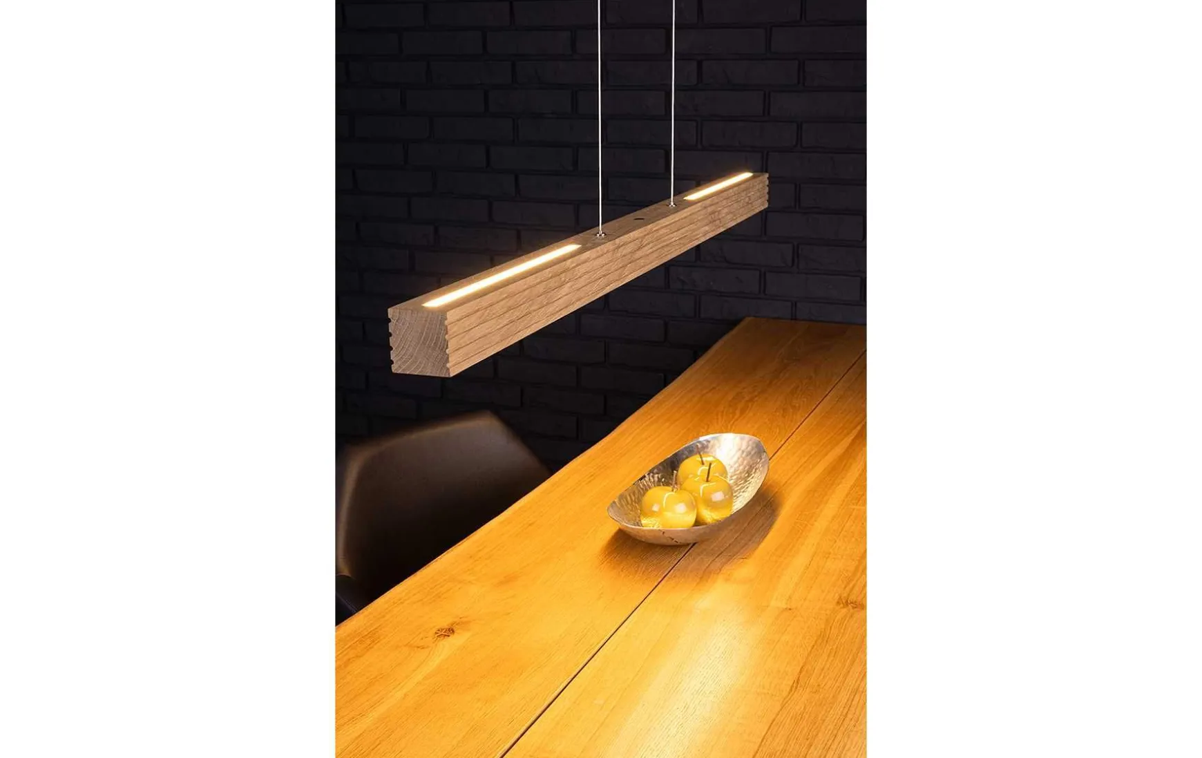 Die Leuchte ist aus europäischem Eichenholz geformt und mit einem Tastdimmer an der Leuchte ausgestattet.