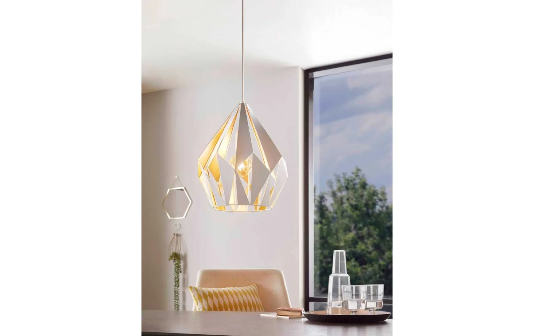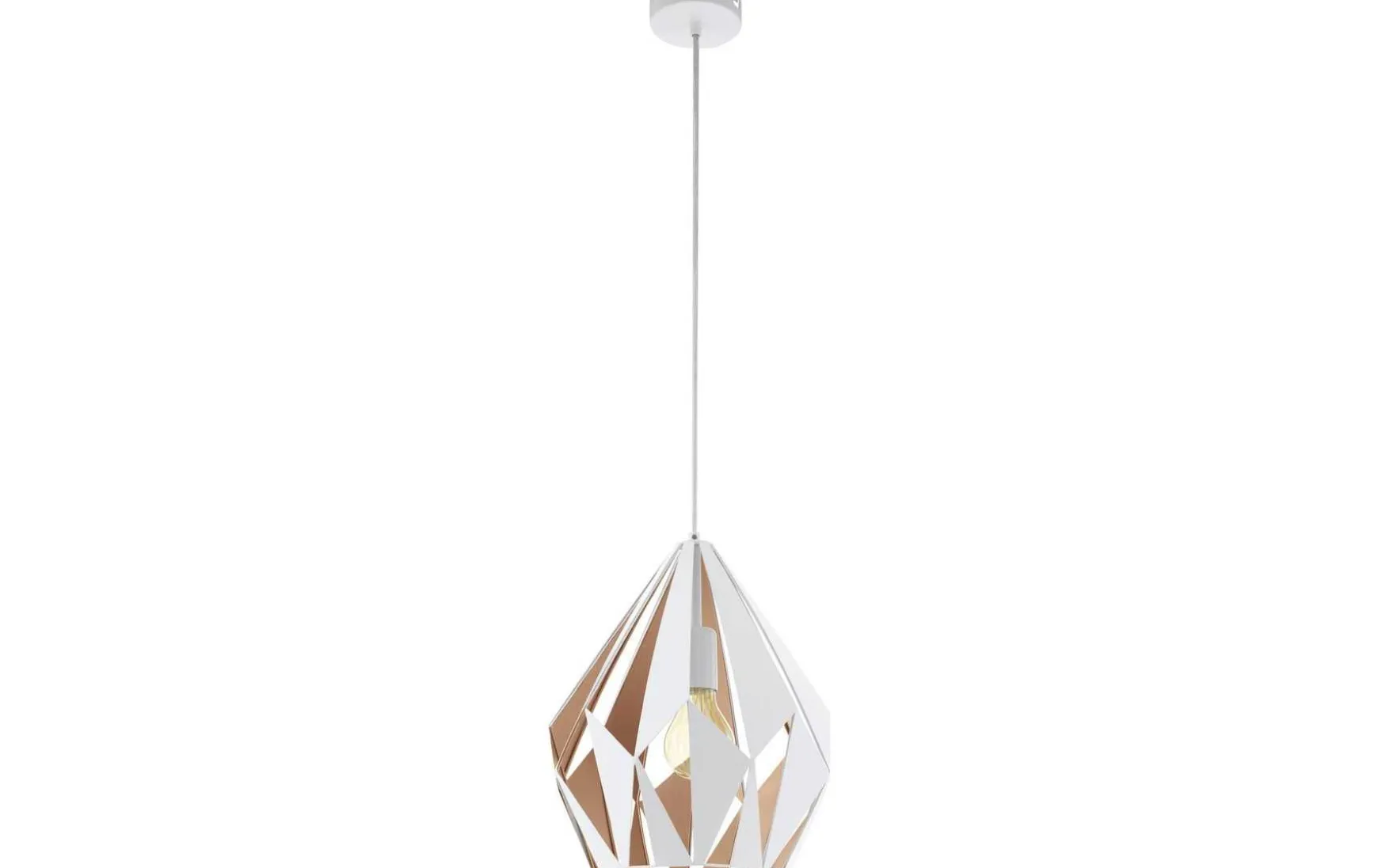 Diese Hängeleuchte ist aus weißem und roségoldenem Stahl gefertigt. Sie verfügt über eine Schutzisolierung und benötigt zum Strahlen ein E27-Leuchtmittel.