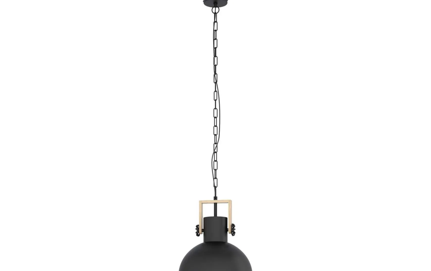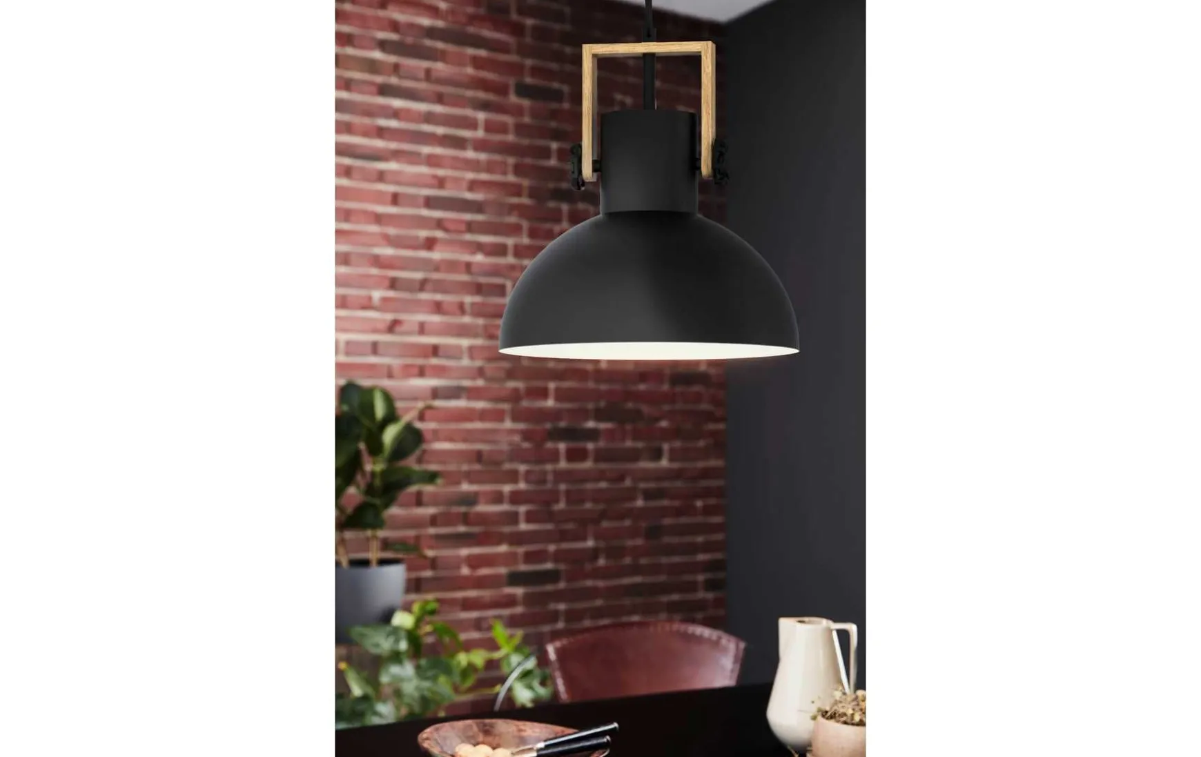 Diese Hängeleuchte besteht aus schwarzem Stahl sowie aus braunem Holz und wird durch Einsetzen eines E27-Leuchtmittels zum optimalen Lichtspender.
