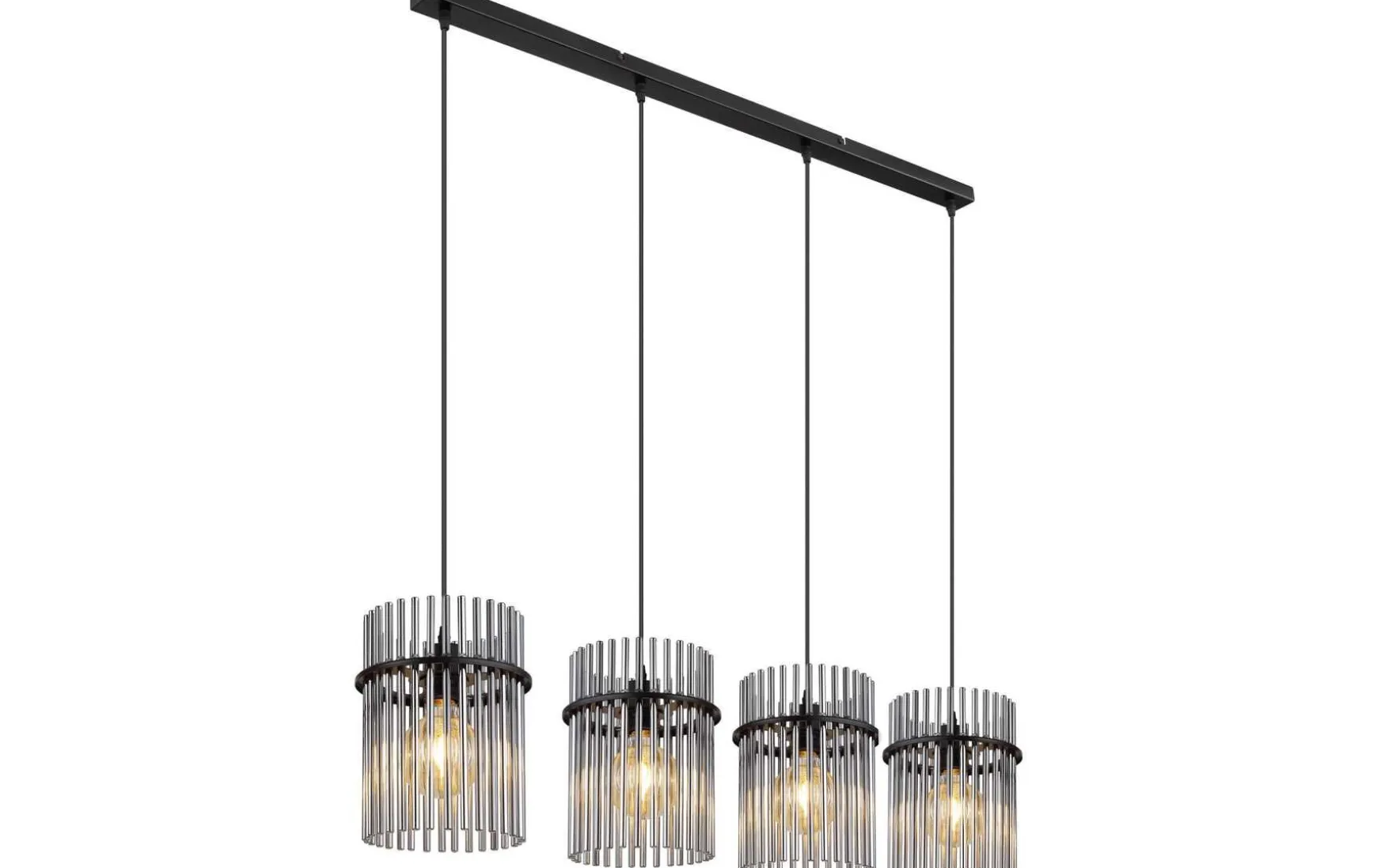 Diese elegante Hängeleuchte begeistert durch modernes Design. Aus einer rechteckigen Deckenbefestigung verlaufen vier bis zu 1,4 m lange schwarze Kabel zu jeweils einer E27 Fassung. Diese sind mit formschönen zylinderförmigen Schirmen aus Glasstäben bestückt und überlassen Ihnen die Möglichkeit, bis zu einer maximalen Leistung von 60 Watt, selbst über Lichtfarbe und Helligkeit zu bestimmen. Aufgrund von Langlebigkeit und Stromersparnis empfehlen wir LED Leuchtmittel.