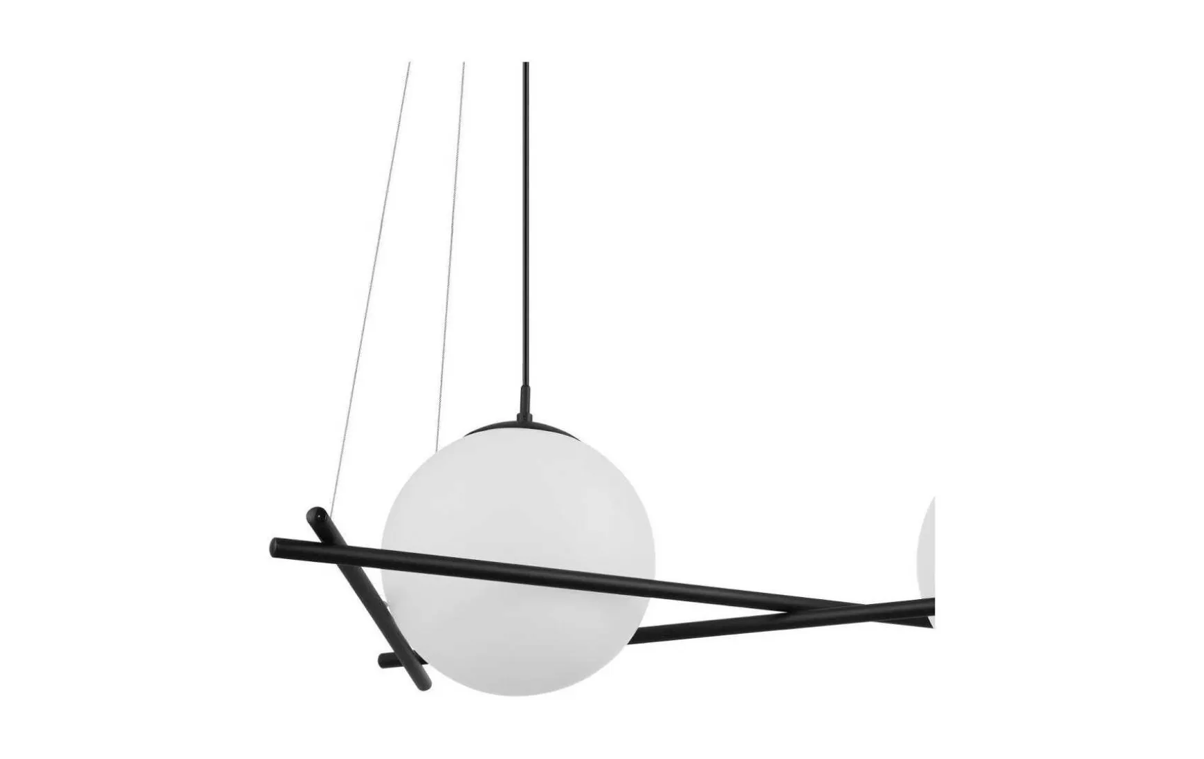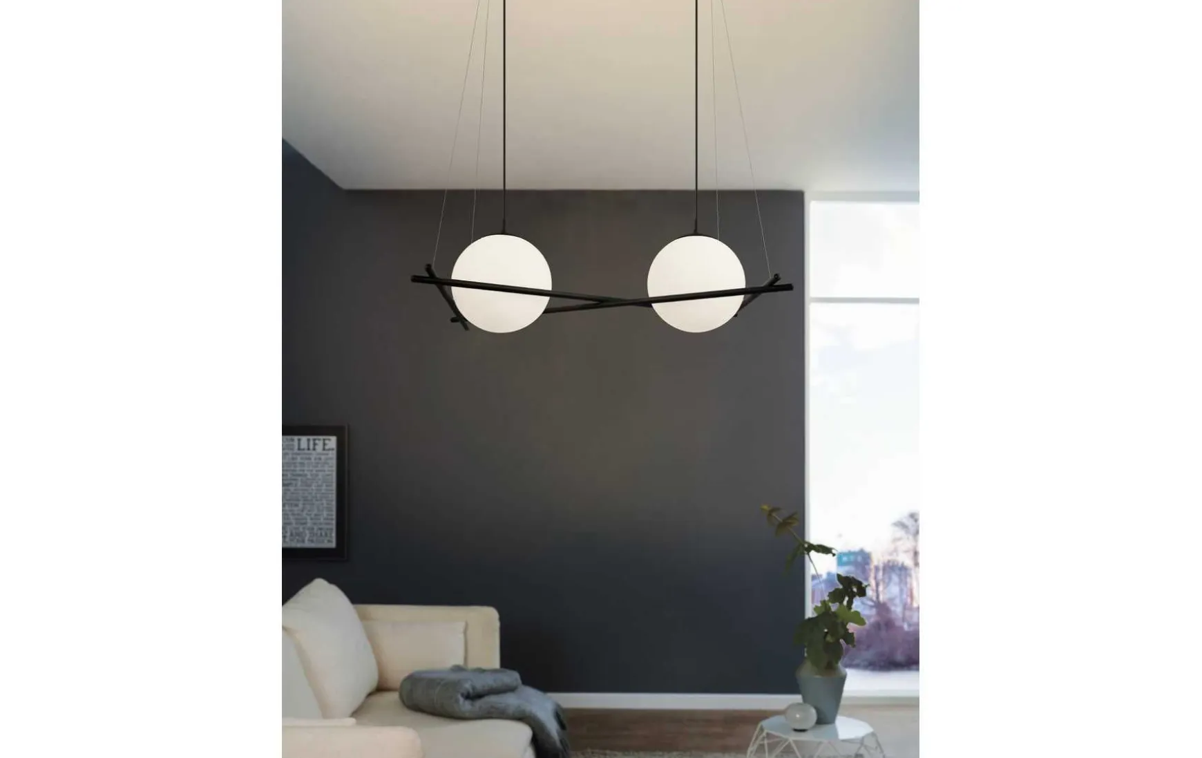Diese Pendelleuchte sorgt mit ihren zwei weißen Leuchtkugeln zwischen der geschwungenen schwarzen Aufhängung, mit E27-Leuchtmitteln für angenehme Lichtverteilung.