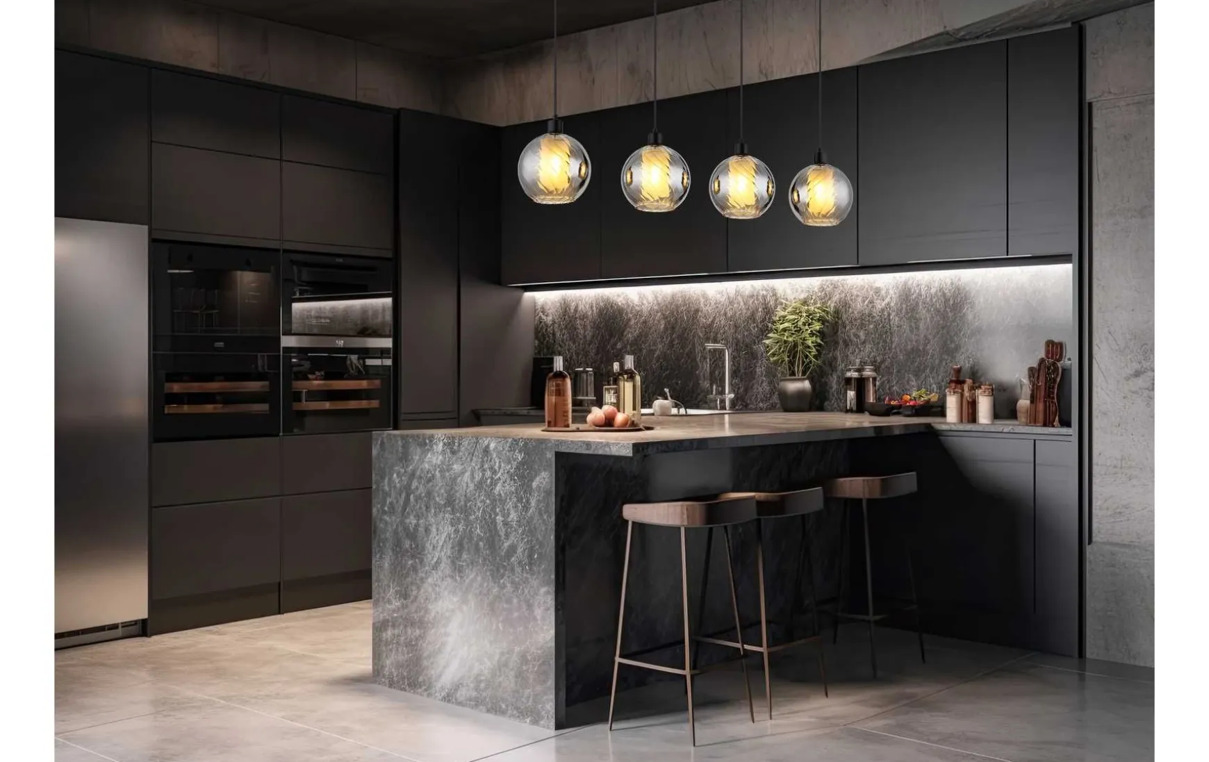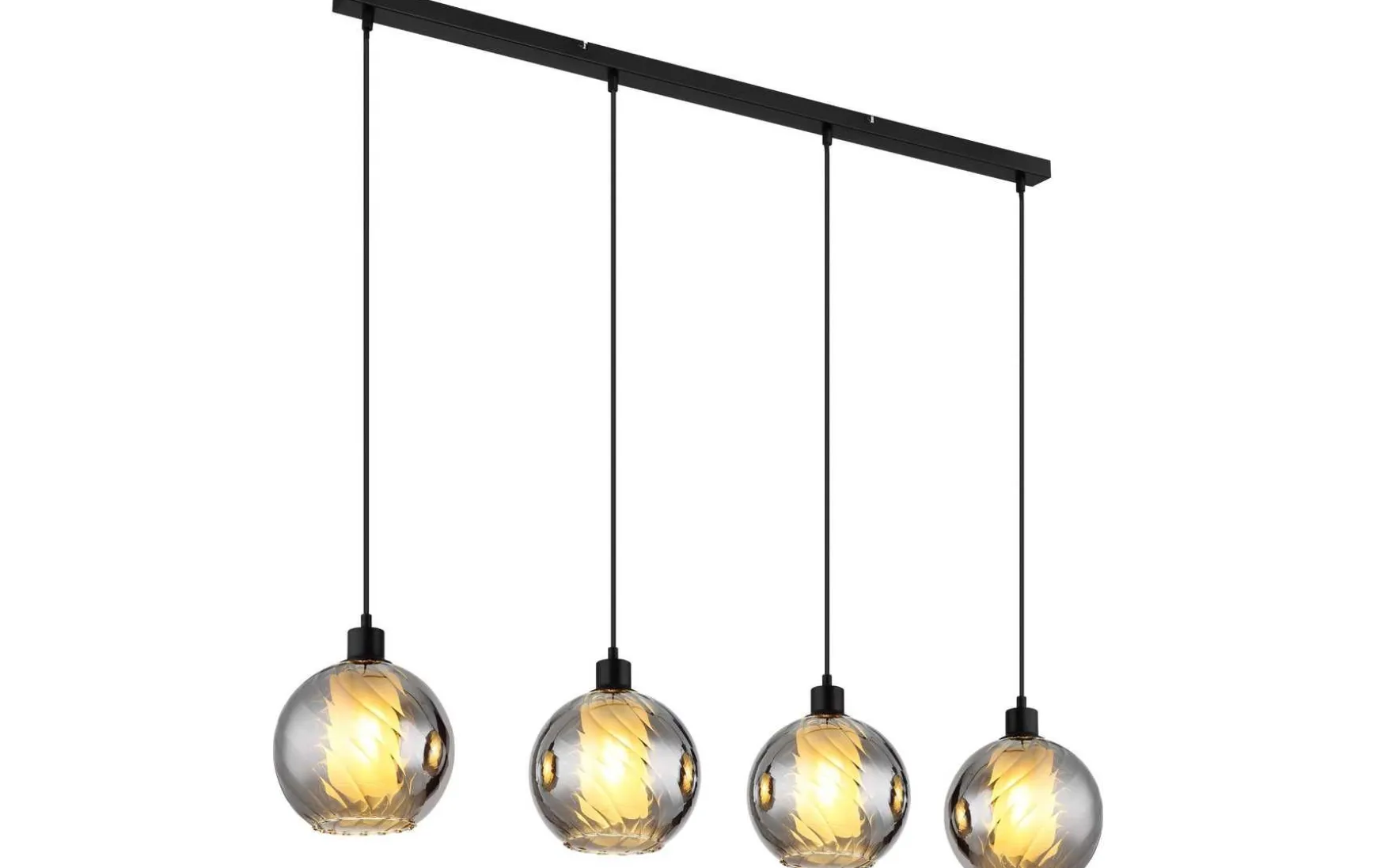 Die gerade Schiene aus matt-schwarzem Metall bildet die perfekte Grundlage für die kunstvoll gestalteten Glaskugeln mit dezenten Rillen und einem Glaszylinder im Inneren.