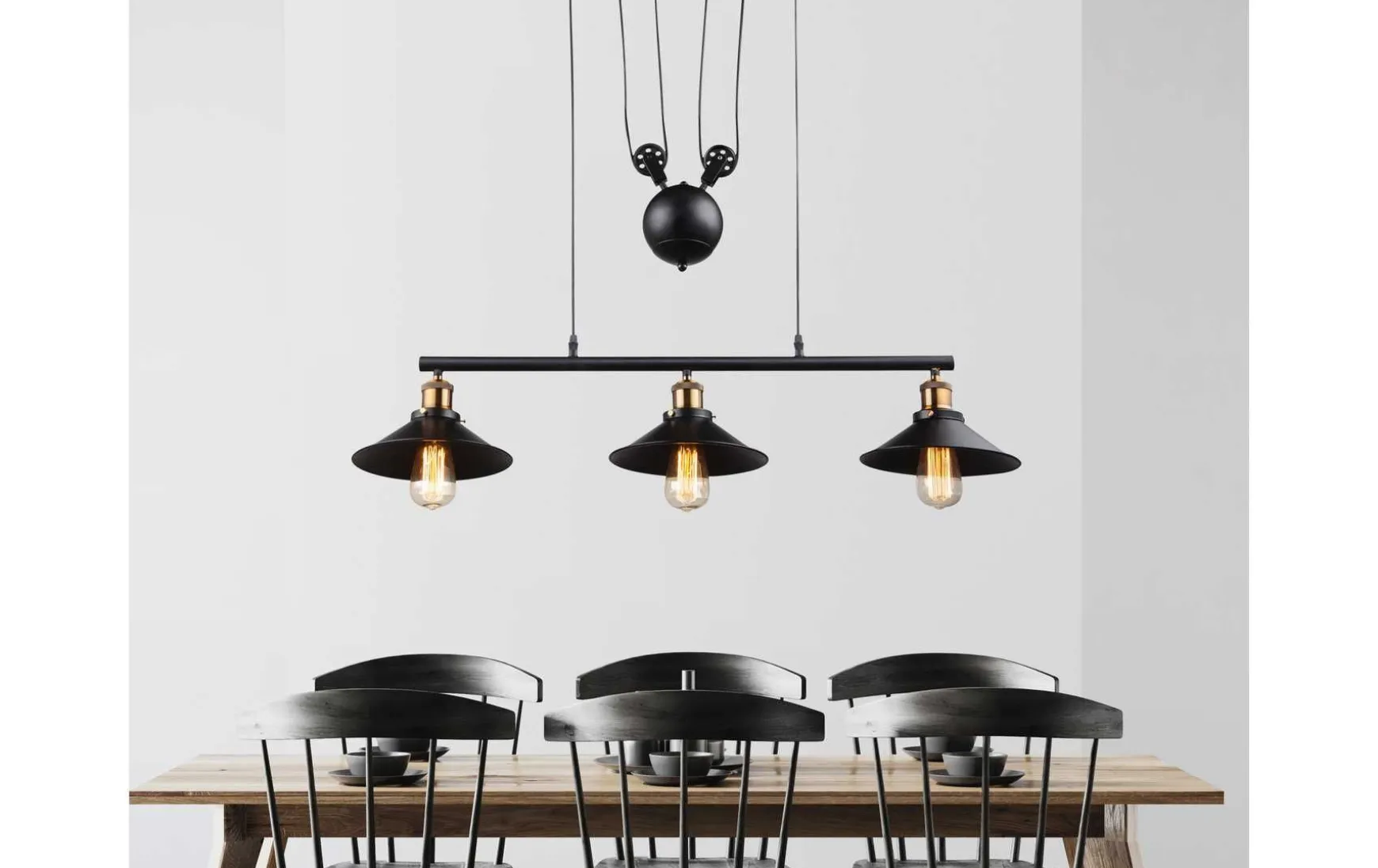 Die drei Lampenschirme, befestigt an einem geraden Arm, lassen sich bei dieser metallischen Pendellampe, in der Farbkombination Schwarz und Altmessing, intelligent über vier Rollen in der Höhe verstellen (90 cm – 180 cm) und bieten Ihnen mit den drei eingebauten E27 Fassungen die Möglichkeit, beliebige Leuchtmittel (max.60W) einzusetzen.