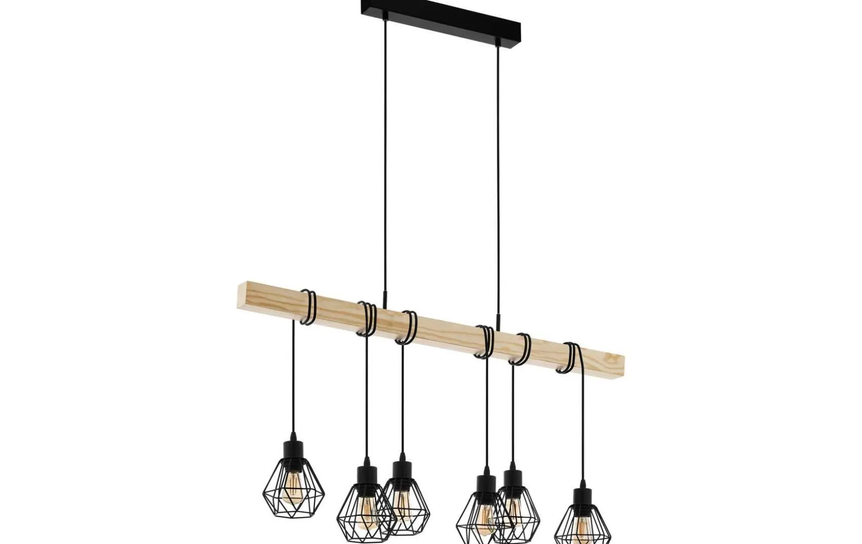 Diese Pendelleuchte besteht aus einem Holzbalken, der mit sechs abgehängten schwarzen Drahtschirmen kombiniert wurde.