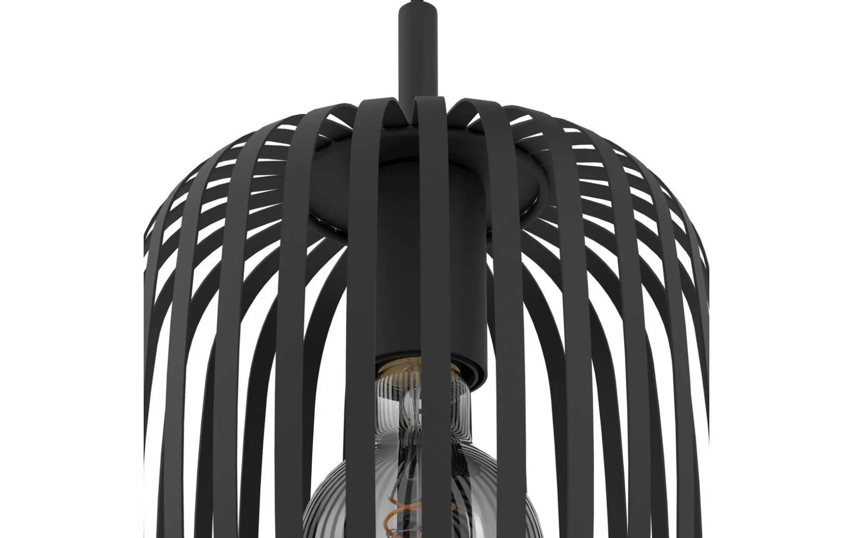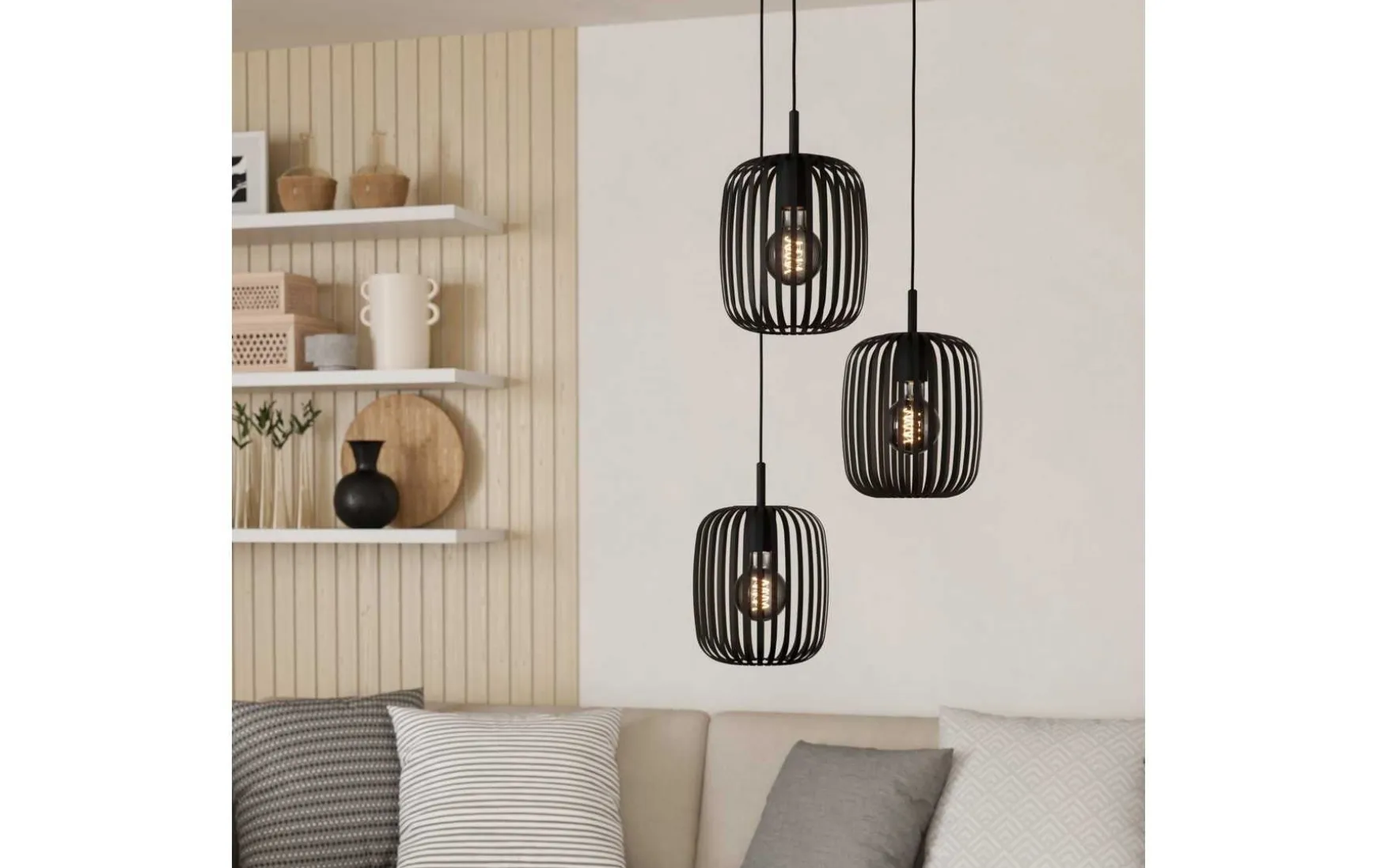 Die Hängeleuchte ist aus drei runden Lampenschirmen aus schwarzen Flachmetallstreifen gefertigt. Die Schirme sind in unterschiedlichen Höhen mittels schwarzer Textilkabel von einem runden Baldachin abgehängt. Durch die Metallbänder entstehen faszinierende Licht- und Schattenspiele, sobald die Leuchte eingeschaltet ist. Die Hängelampe mit ihren soften ballonförmigen Lampenschirmen fügt sich nahtlos in moderne Einrichtungen ein. Sie bietet ein modernes Design für jeden Raum – egal ob in der Küche, im Wohnzimmer oder im Esszimmer über einem Esstisch. Die abgebildeten Filament-Leuchtmittel sind nicht im Lieferumfang enthalten. Geeignet ist die Leuchte für jedes Leuchtmittel mit E27-Sockel.