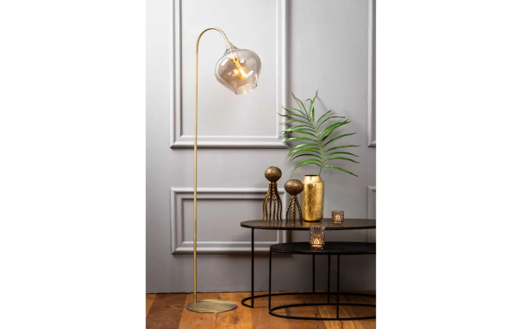Diese Stehleuchte besticht durch ihr elegantes Design und den Lampenschirm aus Glas. Der Lampenständer ist aus goldfarbenem, gebürstetem Metall gefertigt und hat eine matte Oberfläche. Der Lampenschirm ist aus Glas und hat einen schönen Rauchschleier. In Kombination mit der goldenen E27 Fassung wirkt die Lampe luxuriös und modern. Durch die rauchfarbene Oberfläche gibt die Lampe ein stimmungsvolles Licht ab. Da der Lampenschirm verstellbar ist, ist die Lampe nicht nur stilvoll, sondern auch äußerst funktionell. Ideal als Leselampe im Wohnzimmer.