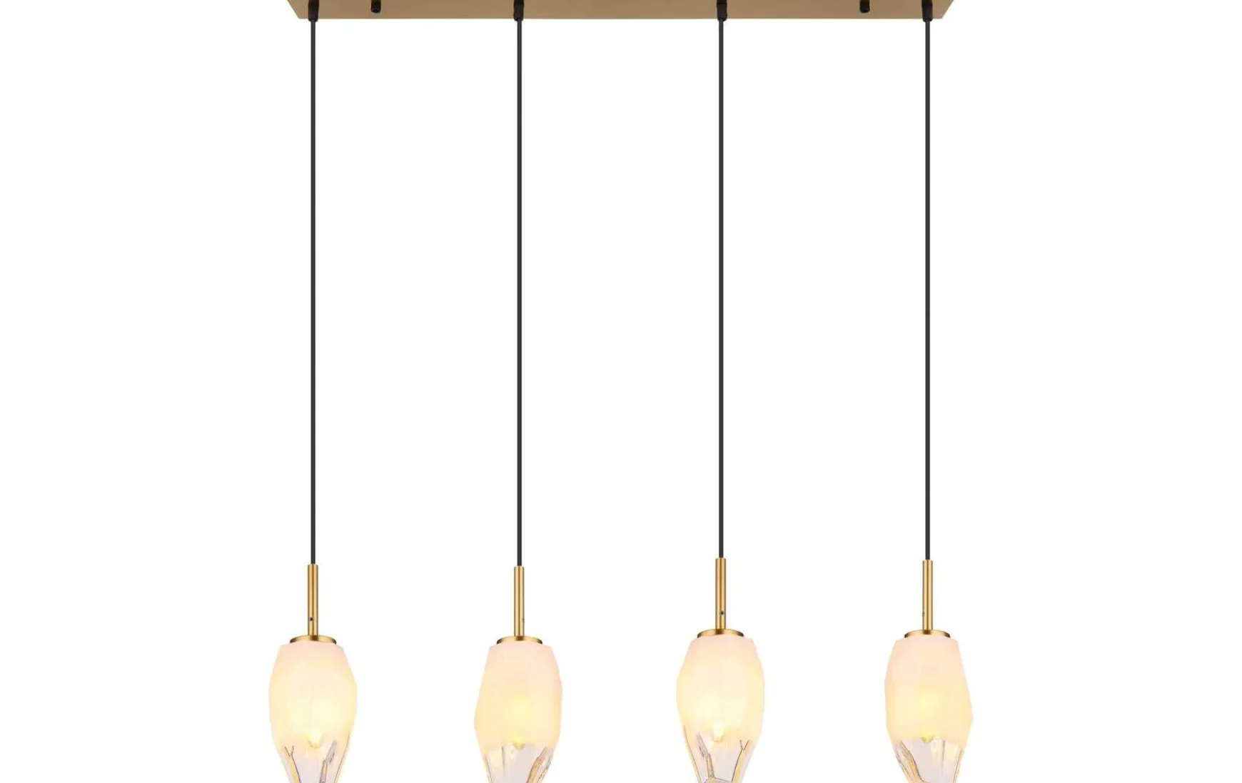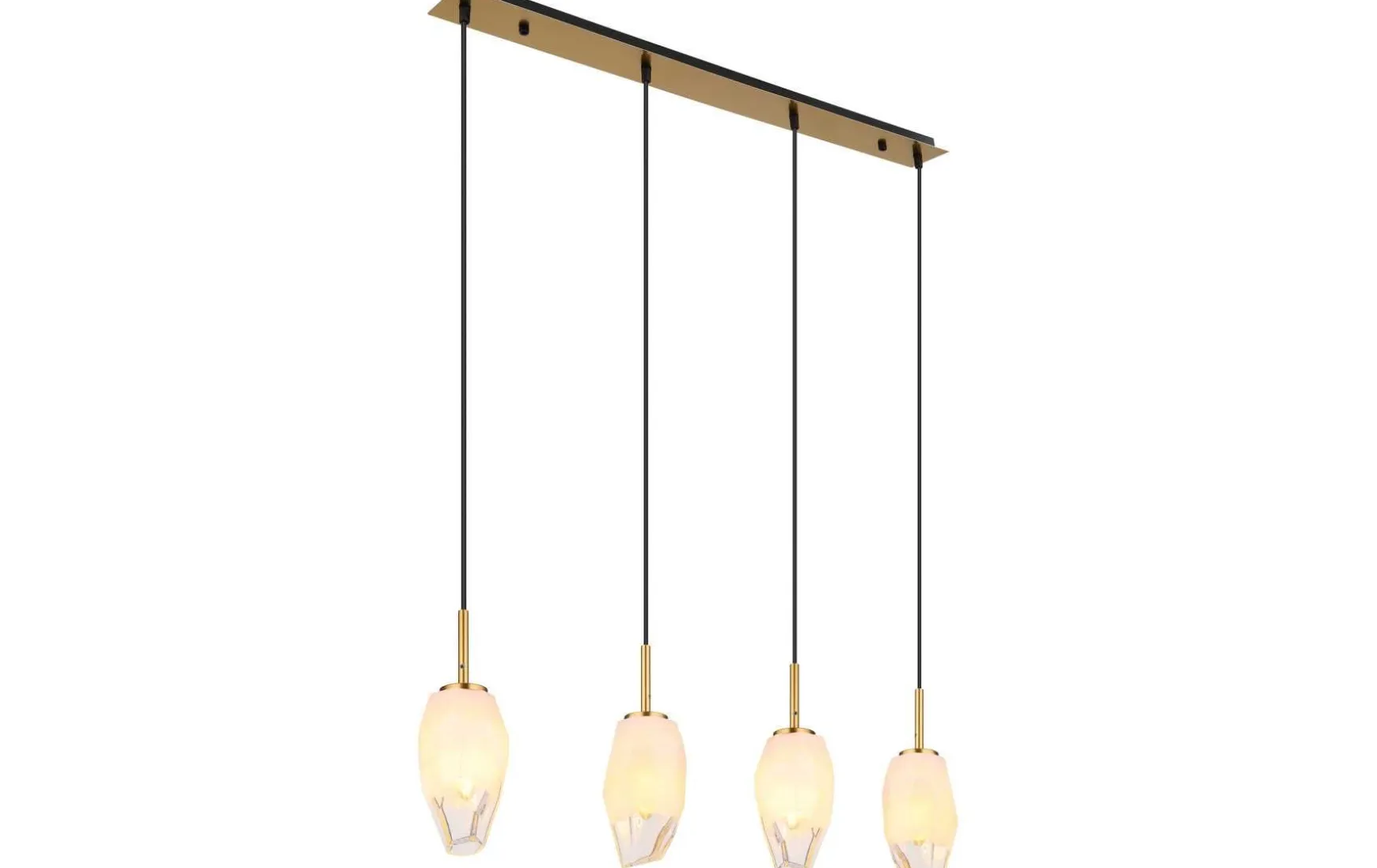 Die Hängeleuchte in messingfarbenem Metall mit opalem und klarem Glas ist eine elegante Wahl für jeden Raum. Das Kabel in PVC Schwarz verleiht der Leuchte einen modernen Touch. Die Leuchte hat eine Größe von 900x110x1200mm und ist somit eine großartige Wahl für mittelgroße Räume. Die Leuchte benötigt 4x E14 LED 7W 230V (nicht inklusive) und sorgt für eine helle und effiziente Beleuchtung. Das opale und klare Glas erzeugt ein und angenehmes Licht. Diese Hängeleuchte ist perfekt für alle, die eine stilvolle und effektive Beleuchtungslösung suchen.