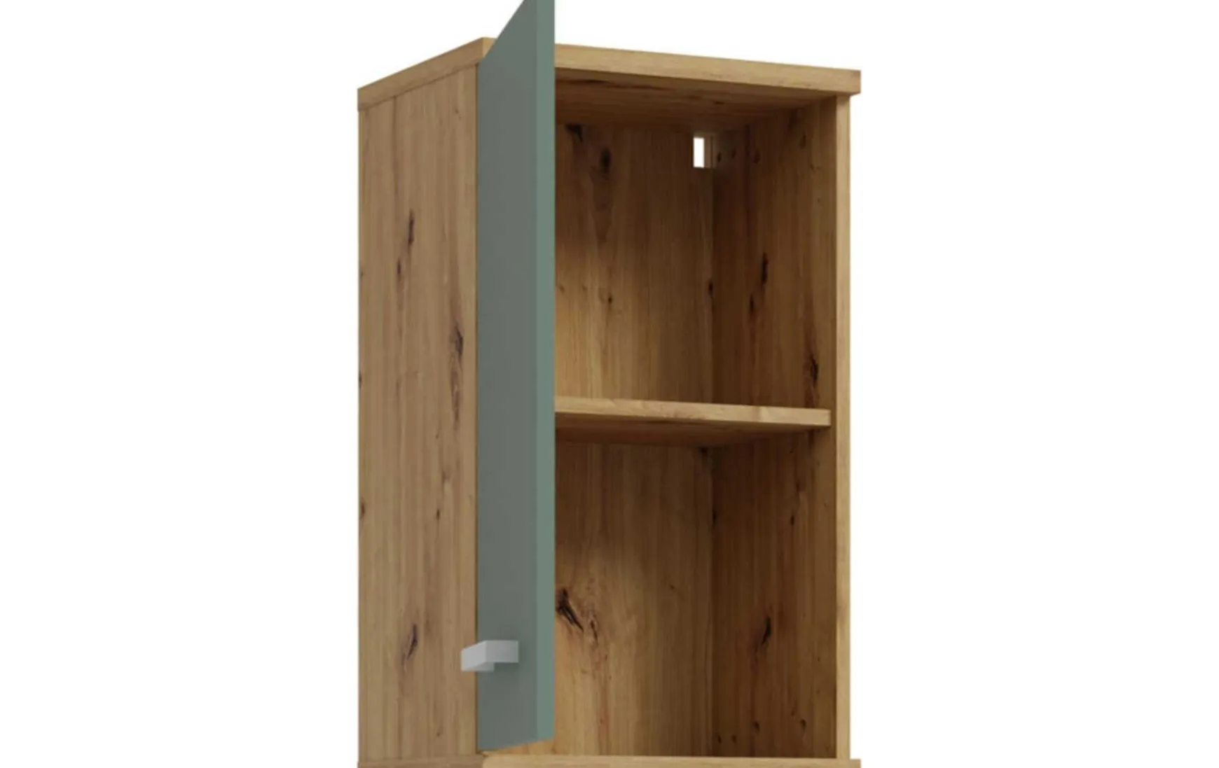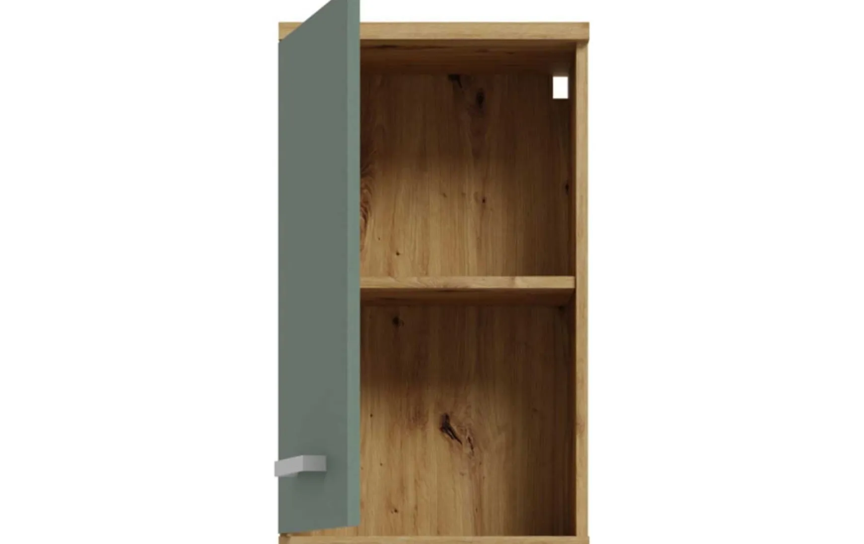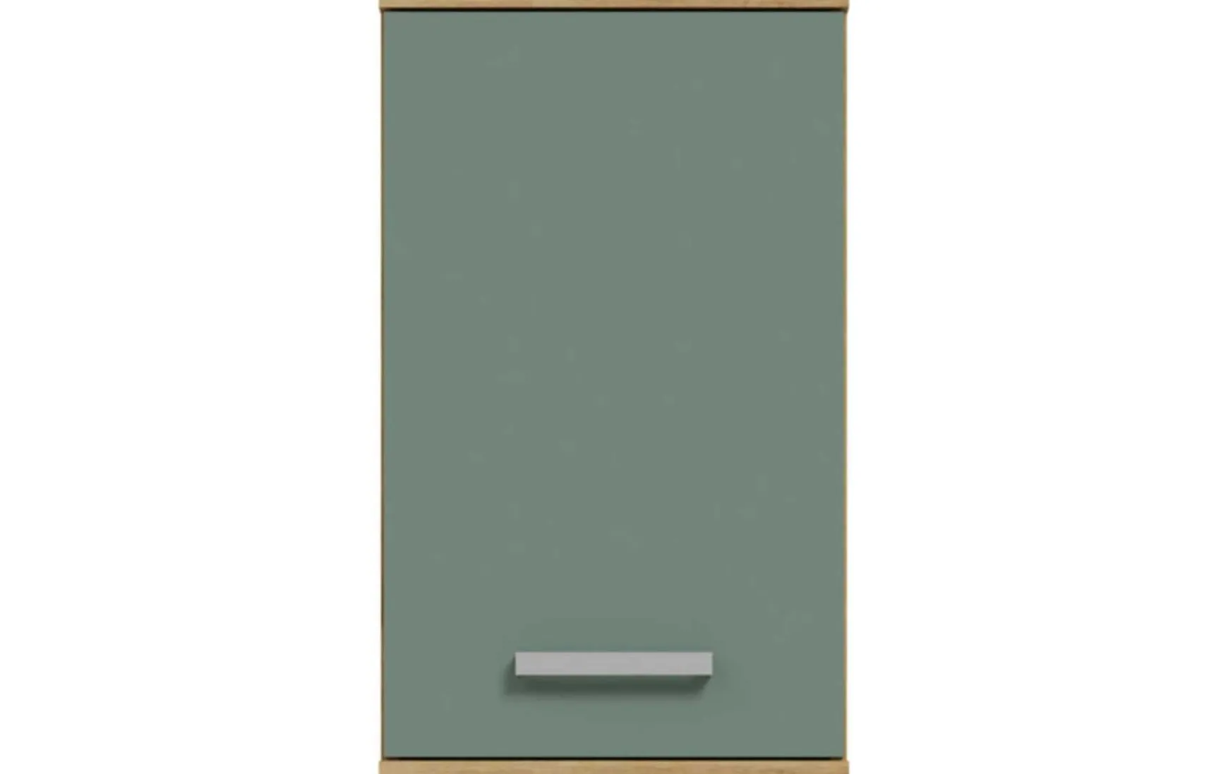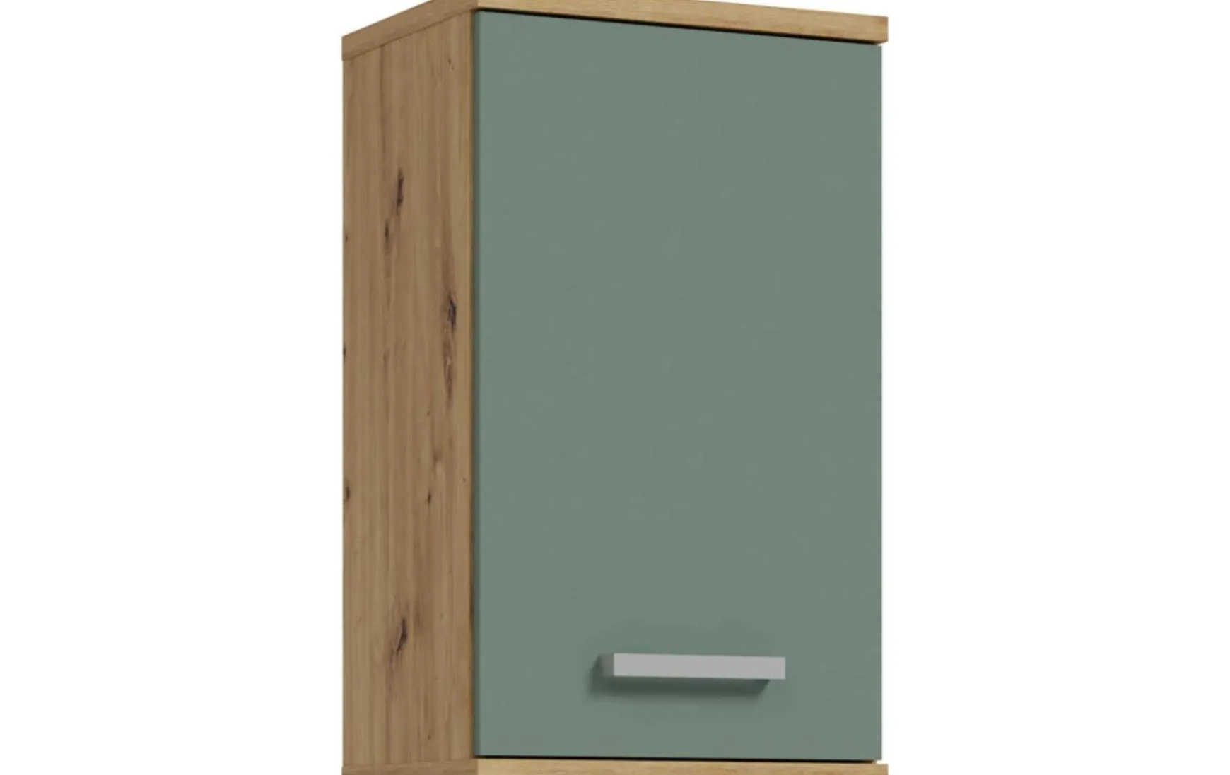 Die moderne Farbkombination aus Salbeigrün mit Artisan-Eiche-Korpus verleiht dem Hängeschrank eine natürliche, wohnliche Ausstrahlung und wird durch silberfarbene Griffe harmonisch ergänzt. Gefertigt aus robuster Spanplatte, ist das Möbel langlebig und pflegeleicht – die Oberfläche kann einfach trocken abgewischt werden. Mit Maßen von ca. 40 x 29 x 69 cm (B/T/H) bietet der Schrank kompakten Stauraum.