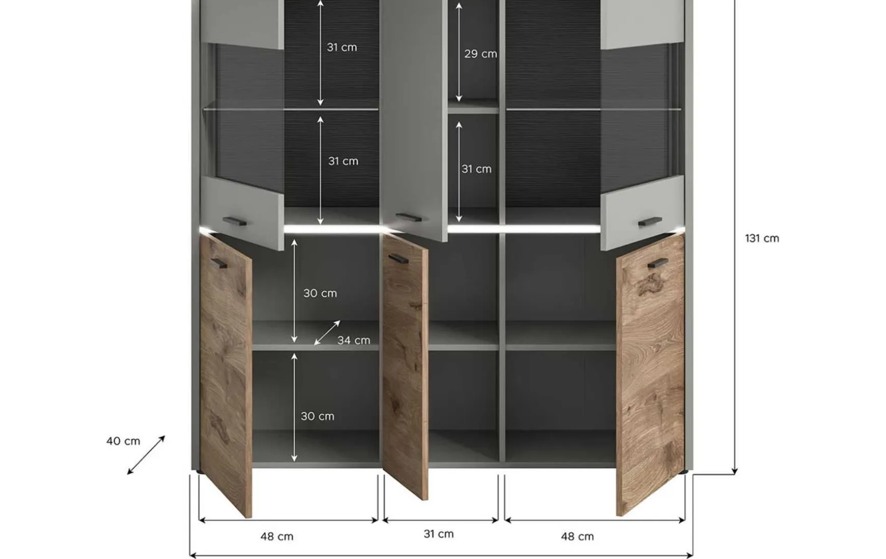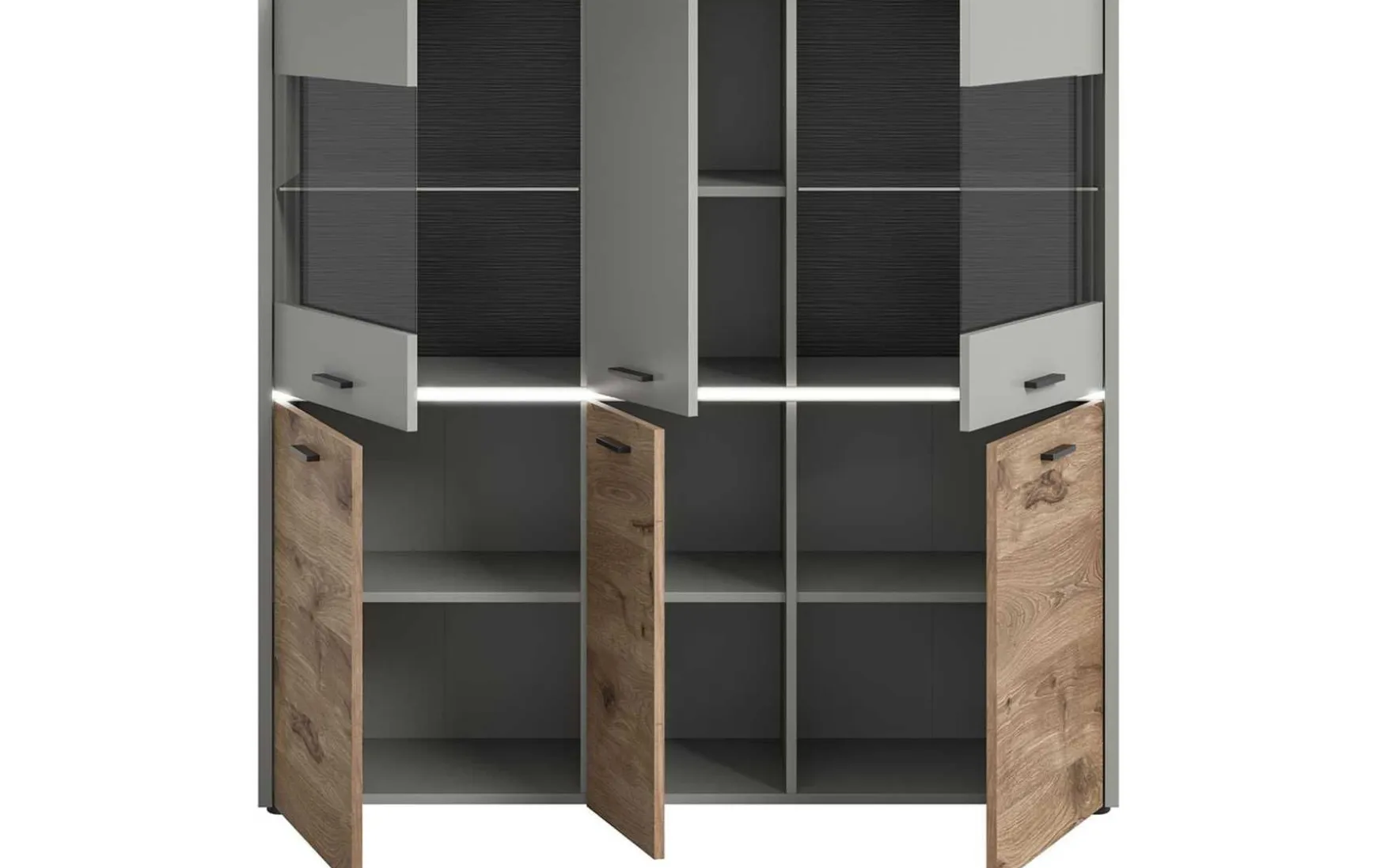Mit 6 Türen bietet das Sideboard großzügigen Stauraum für Geschirr, Dekorationen oder Alltagsgegenstände. Die Ausstattung im Inneren umfasst: