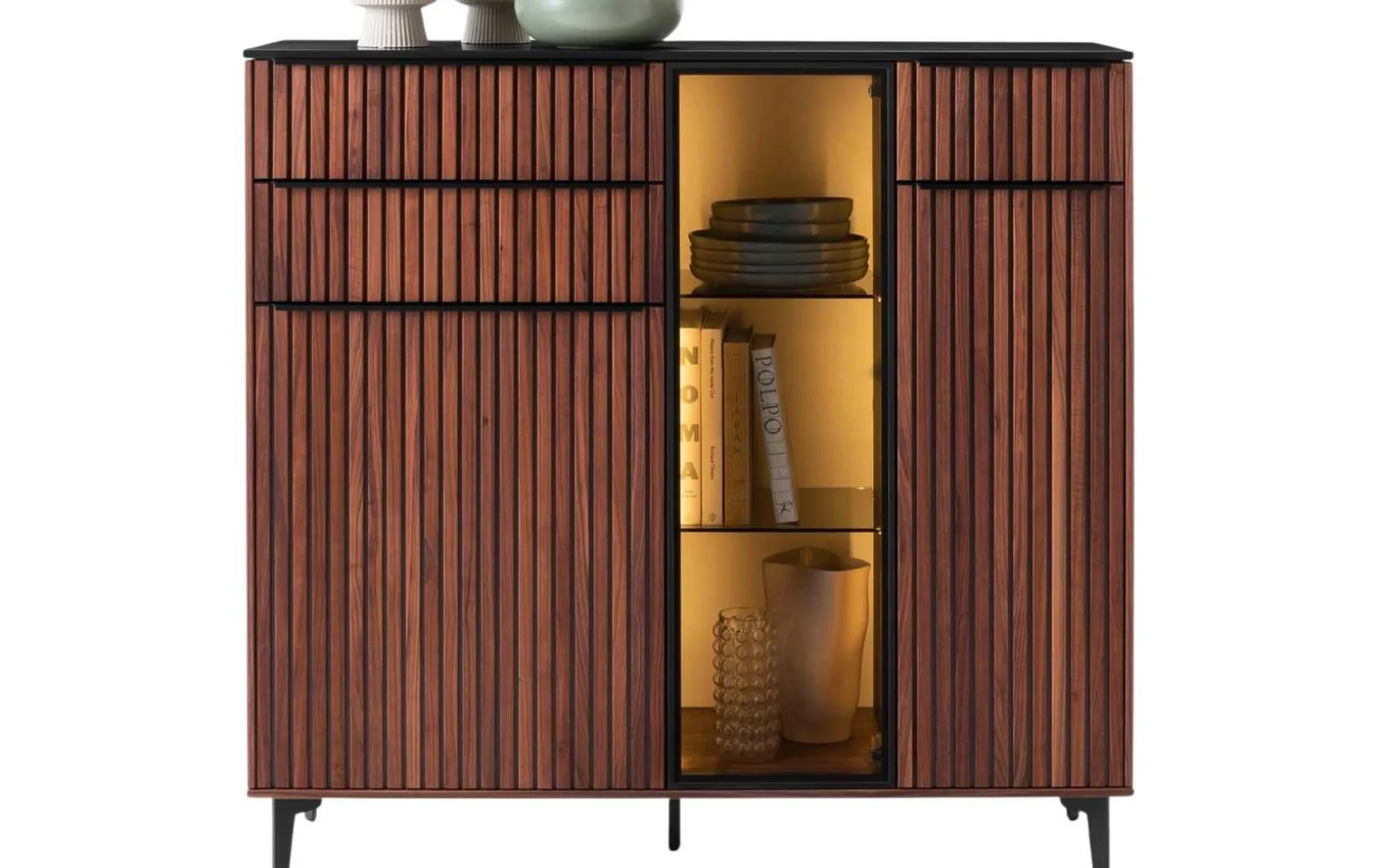 Dieses hochwertige Highboard überzeugt durch die edle Kombination aus massivem Nussbaumholz und schiefer-schwarzen Akzenten. Das schwarze Metallgestell verleiht dem Möbelstück einen modernen, klaren Look und sorgt gleichzeitig für Stabilität. Mit zwei Türen und drei Schubläden bietet das Highboard viel Stauraum und eignet sich ideal für Wohn- oder Essbereiche. Dank nachhaltiger Herstellung ist es zudem eine umweltbewusste Wahl.