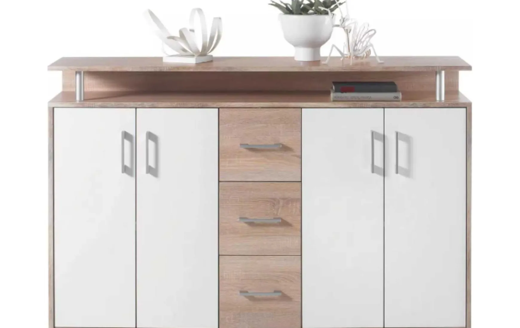 Mit dem Sideboard bringen Sie Ordnung in Ihr Ziimmer. Der Schrank hat vier weiße Drehtüren, hinter denen sich ein Regal und drei Schubladen im Eichendekor befinden. Oben ist ein zusätzlicher Einlegeboden angebracht, der den Eindruck erweckt, über dem Schrank zu schweben. Dies verleiht dem Sideboard ein modernes Aussehen und bietet zudem mehr Stauraum.