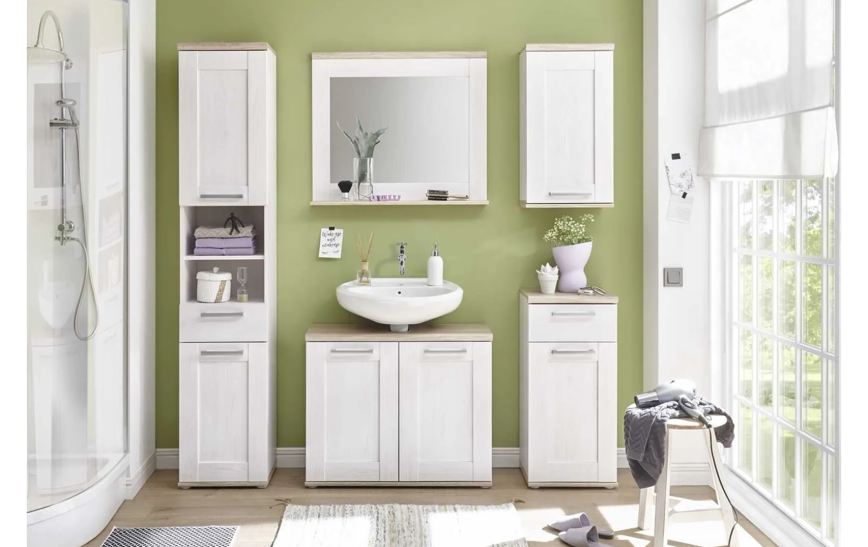 Der freistehende Hochschrank im klassischen Landhausstil überzeugt durch sein zeitloses Design und durchdachten Stauraum auf schlanker Stellfläche. Mit zwei Türen, einer Schublade, zwei offenen Fächern und drei Böden bietet der Schrank vielfältige Aufbewahrungsmöglichkeiten für Bad, Flur oder Wohnbereich. Die helle Farbgestaltung in Sibiu Lärche mit stilvoller Absetzung in San Remo Eiche verleiht dem Möbelstück eine freundliche, natürliche Ausstrahlung, während alufarbene Griffe einen modernen Akzent setzen. Gefertigt aus robuster Spanplatte ist der Hochschrank pflegeleicht, langlebig und ideal für den täglichen Gebrauch. Dank seiner kompakten Maße passt er auch perfekt in schmalere Räume.