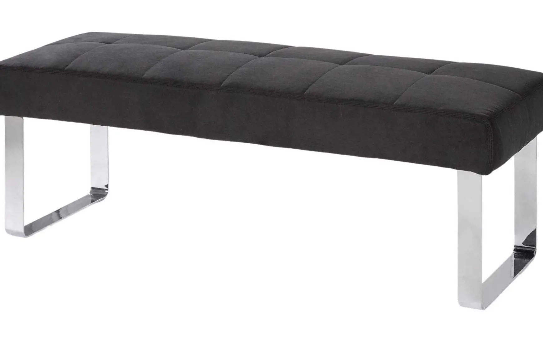 Die moderne Hockerbank passt perfekt zu der Eckbank aus der selben Serie. Der Sitz im Grauen Bezug bildet eine schönen Übergang zu den verchromten Kufengestell. Auch in anderen Stoffen oder Lederbezügen möglich.