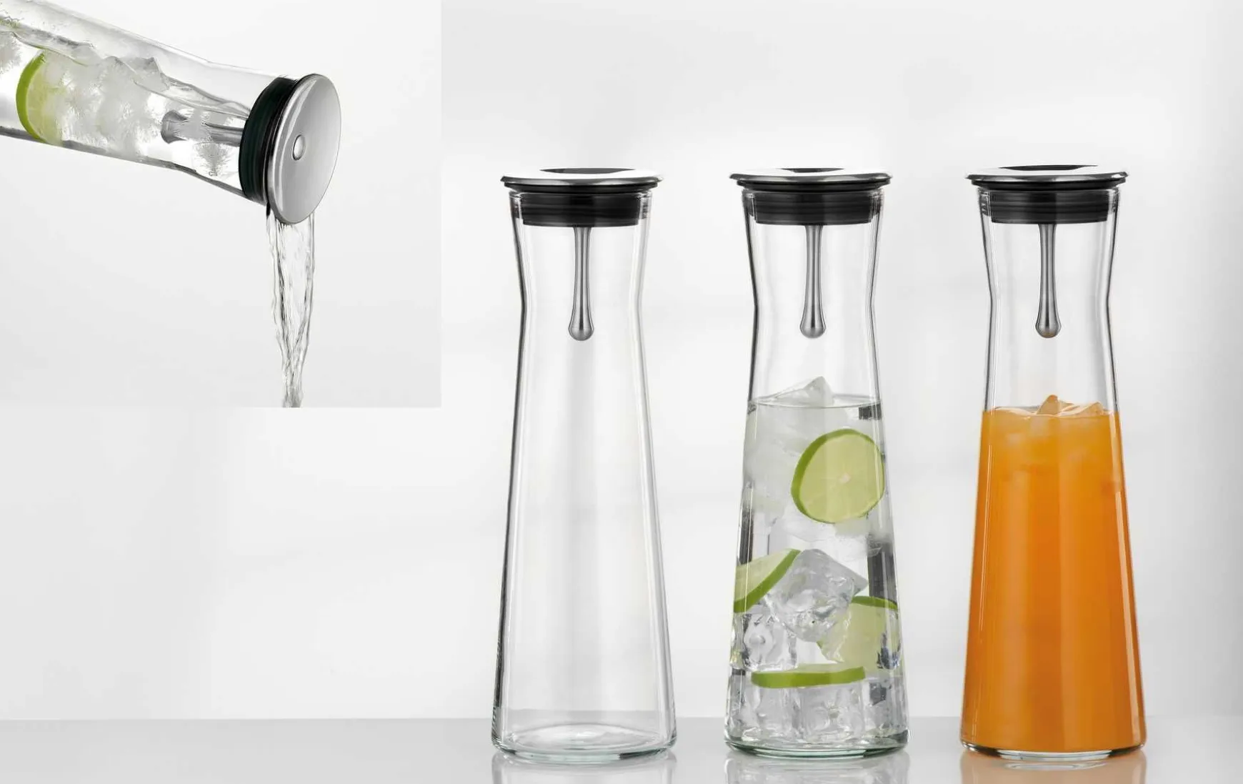 Die formschöne Karaffe aus hitzebeständigem Glas. Deckel mit Ausgießfunktion aus Edelstahl, daher ist mit dieser Karaffe ein tropffreies Ausgießen möglich. Schützt das Getränk vor Verunreinigung und gleichzeitig bleiben z.B. Eiswürfel und Zitronenscheiben beim Ausgießen in der Karaffe. Selbstverständlich ist sie auch spülmaschinengeeignet.
