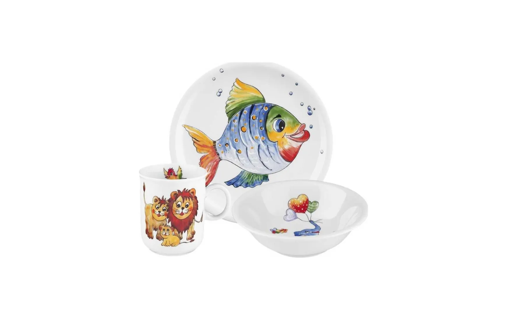 Dieses 3-tlg. Kindergeschirr mit dem für Kinderaugen spannendem Motiv besteht aus robustem Porzellan. Das hochwertige Set (0,7 kg) ist daher spülmaschinen- und mikrowellengeeignet. Es umfasst einen Frühstücksteller (19 cm), eine Schüssel (16 cm) und einen kindgerechten Henkelbecher (0,25 l).