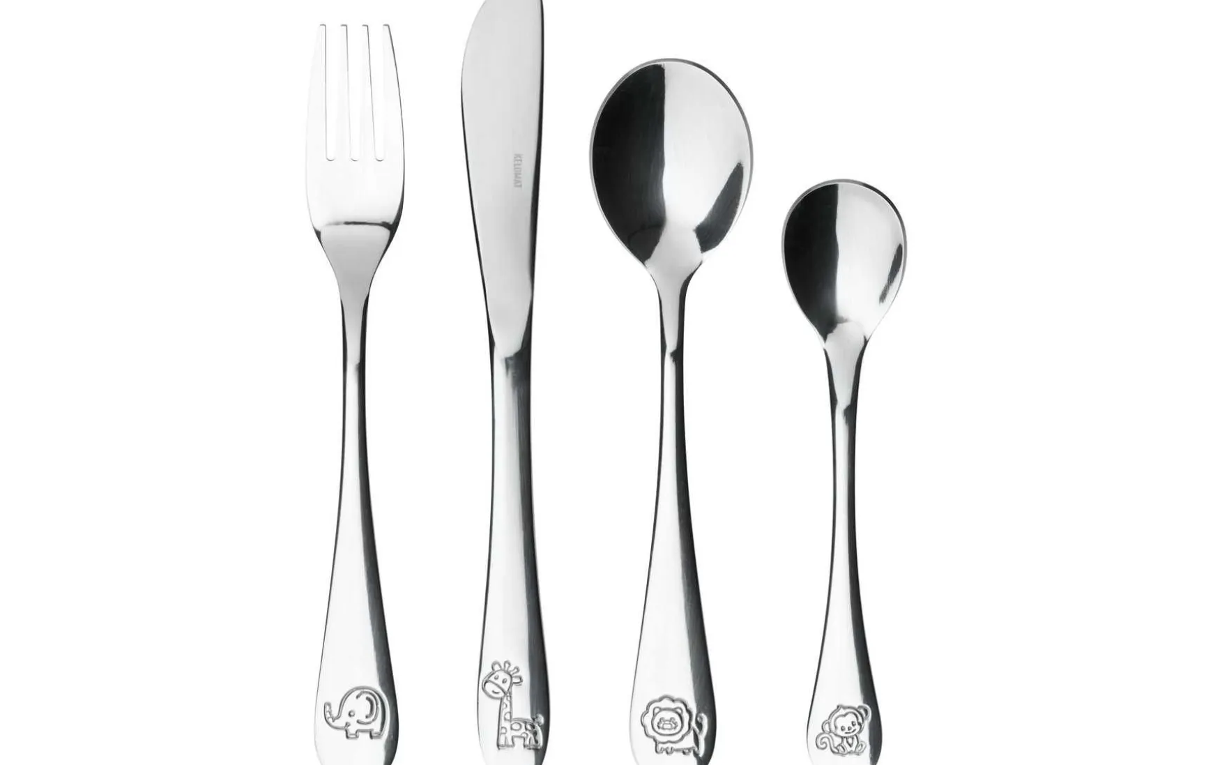 Das Kinderbesteck aus Edelstahl rostfrei besteht aus Kindergabel, Kindermesser, Kinderlöffel und kleinem Kinderlöffel.